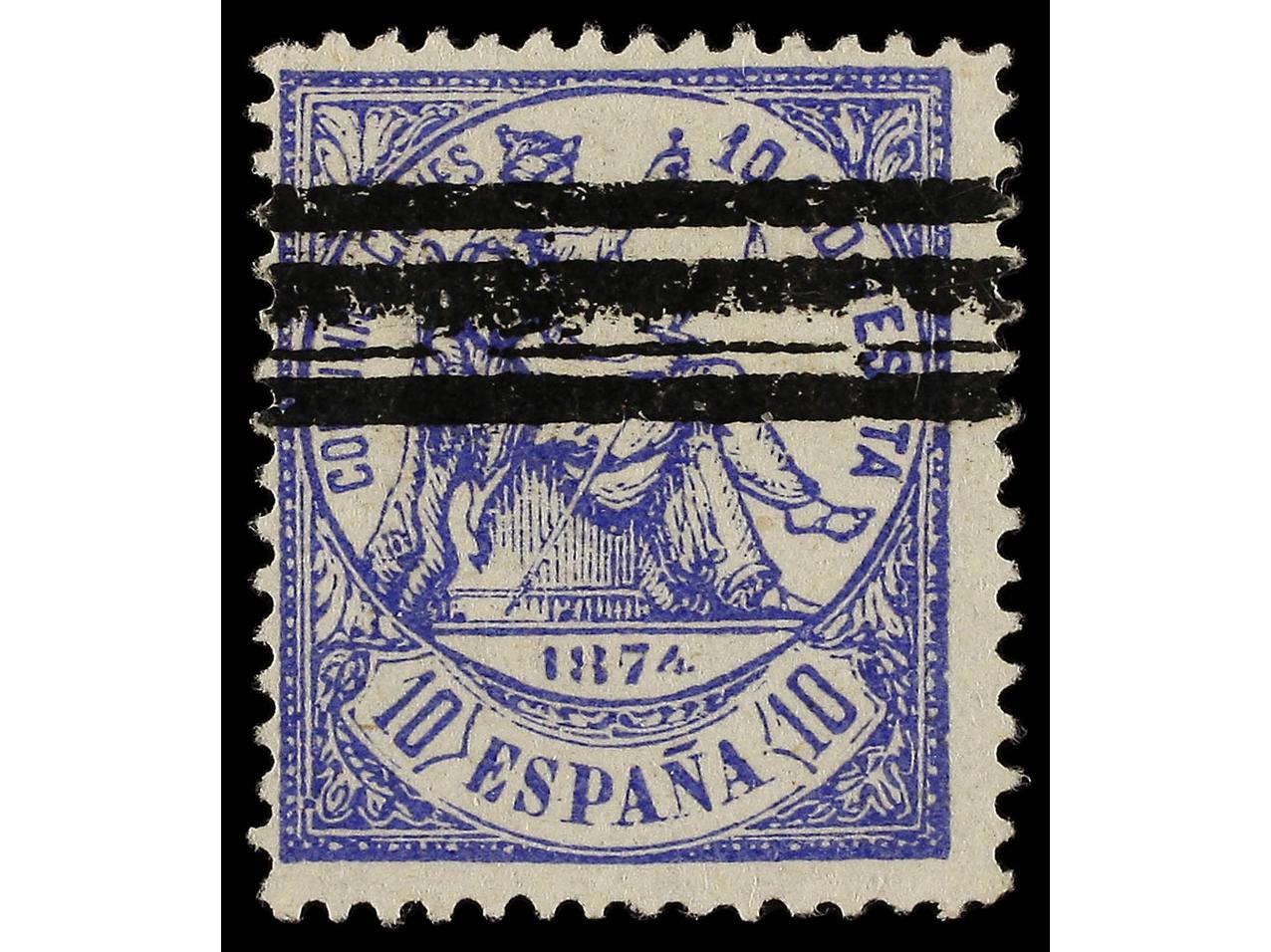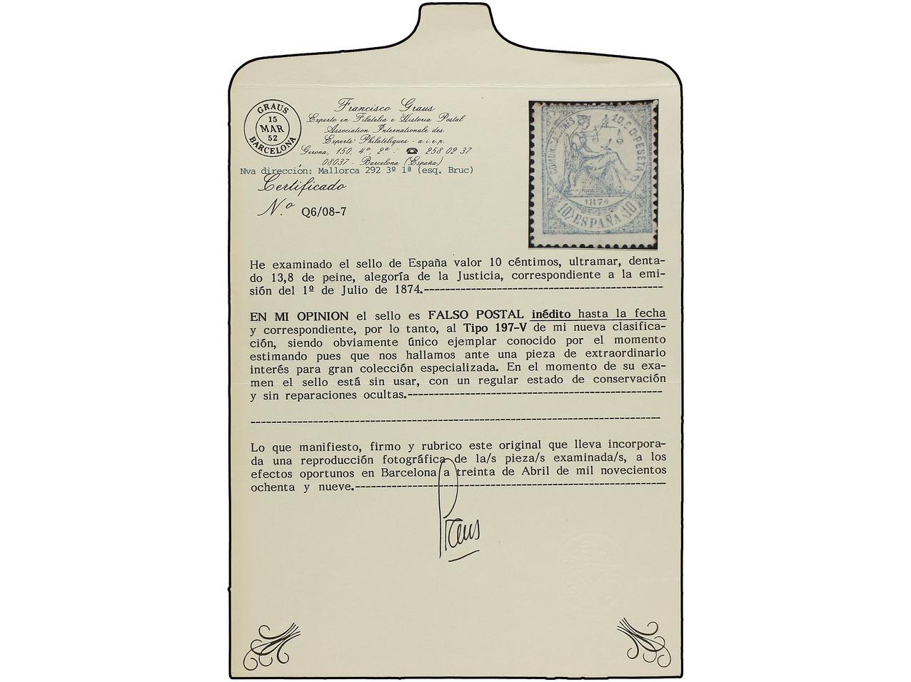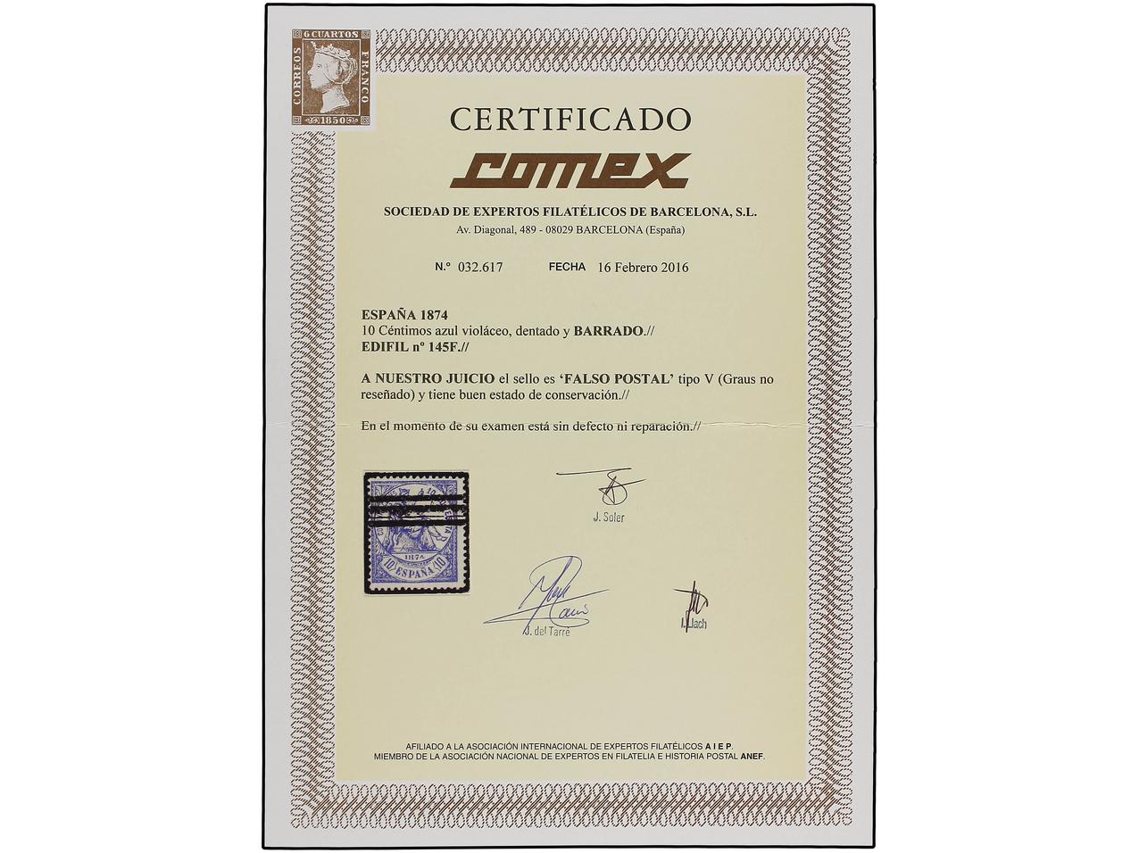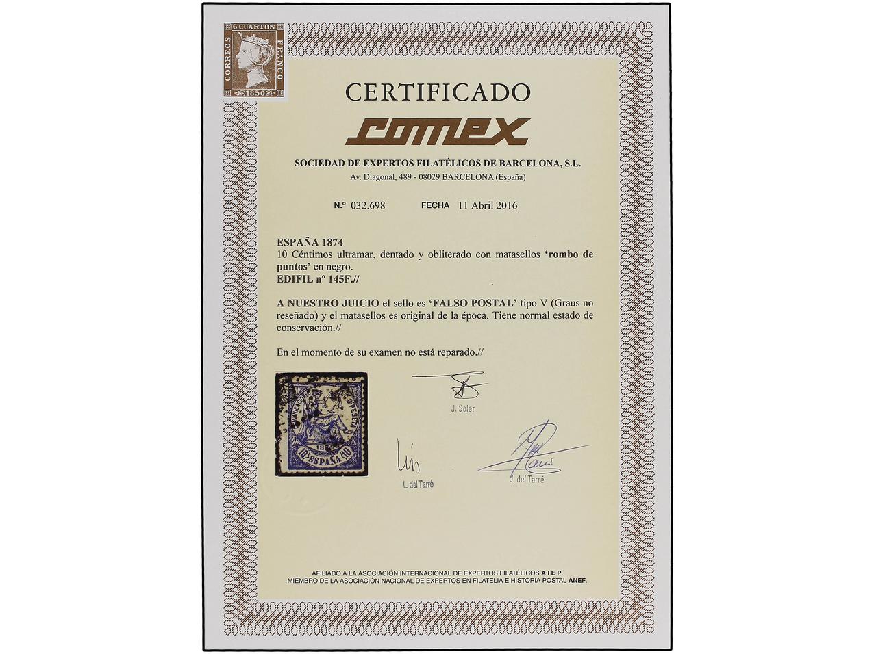 ESPAÑA. 10 cent. azul FALSO POSTAL tipo V (Graus no reseñado) BARRADO. EXTRAORDINARIAMENTE RARO, sólo se conocen tres sellos (nuevo, usado y barrado). Cert. COMEX. Ed.145F. (Image1) (Image2)