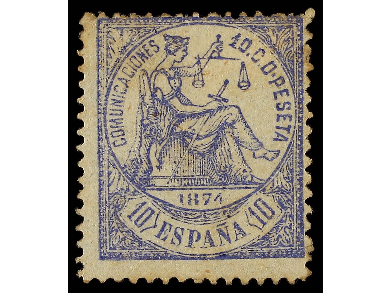 ESPAÑA. 10 cent. azul, FALSO POSTAL, tipo V. EXTRAORDINARIAMENTE RARO, sólo este ejemplar en nuevo y el usado que ofrecemos a continuación conocidos. Cert. GRAUS. (Graus no reseñado). Ed.145F. (Image1) (Image2)