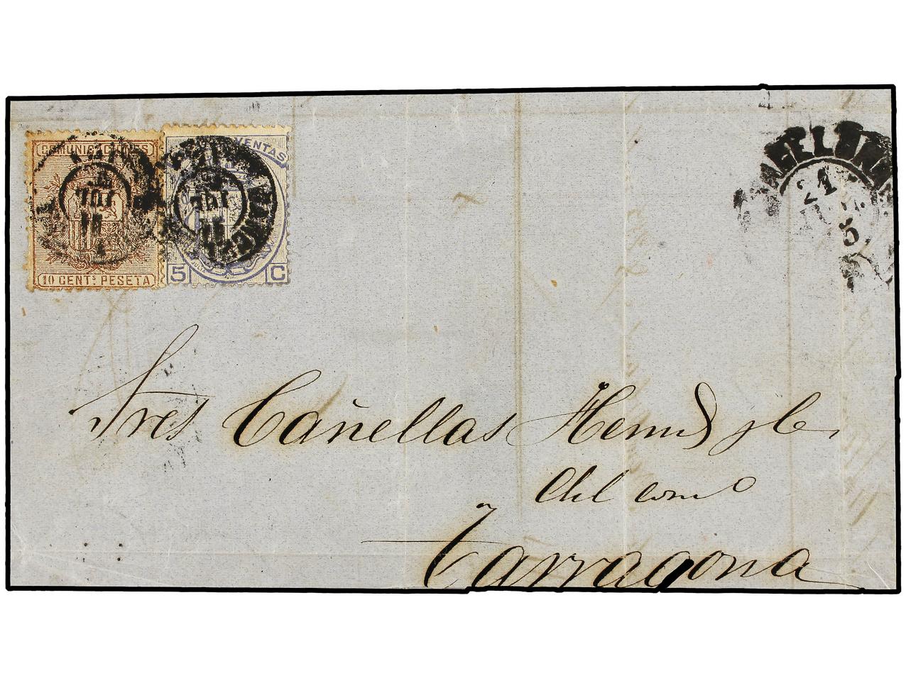 ESPAÑA. 1875. BARCELONA a TARRAGONA. 10 cent. castaño. FALSO POSTAL tipo III y sello de IMPUESTO DE VENTAS de 5 cts. azul sustituyendo al sello de Imp. de Guerra. A pesar de tratarse de una envuelta (falta la solapa inferior del reverso),