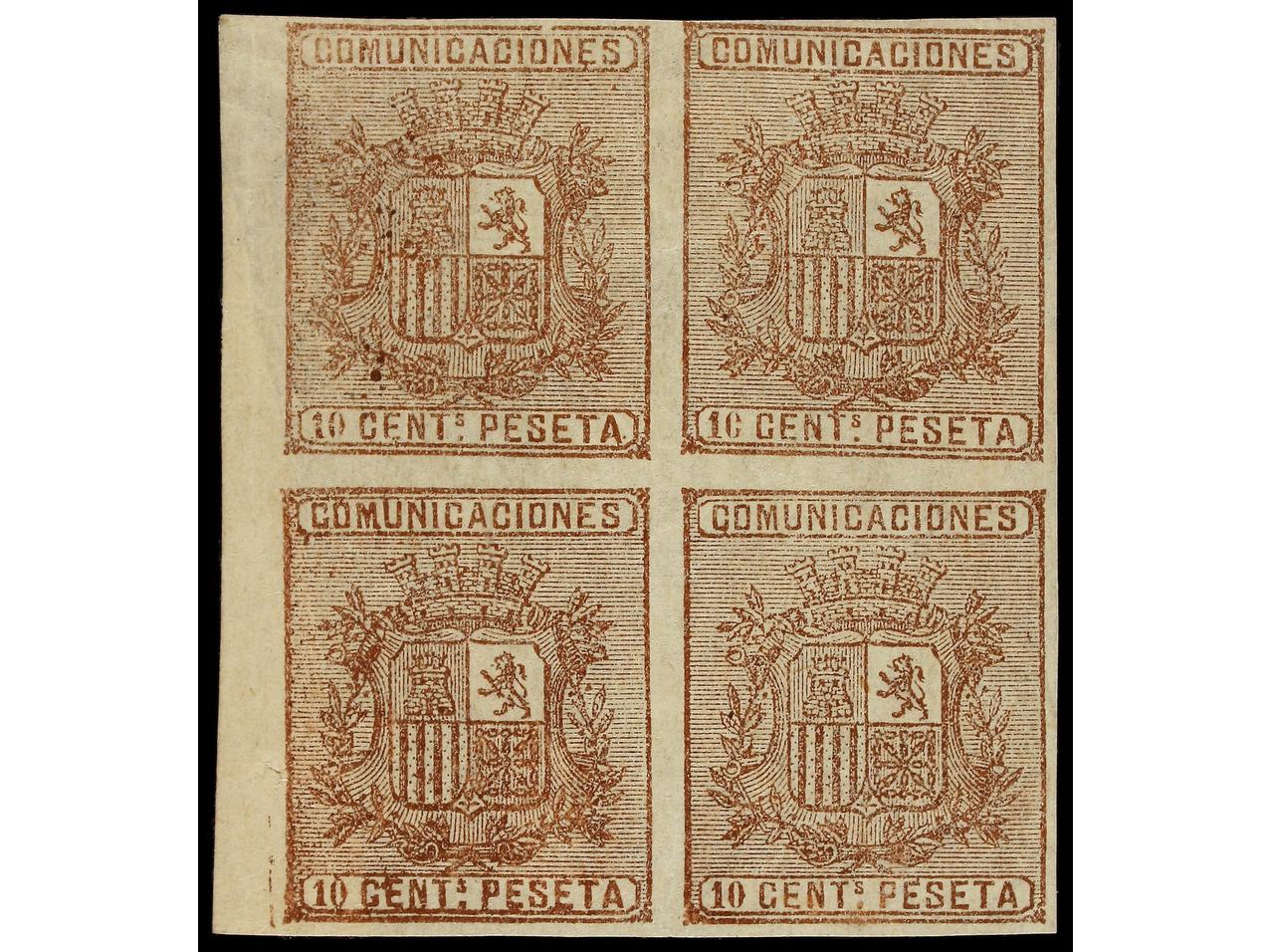 ESPAÑA. 10 cent. castaño. FALSO POSTAL tipo III. Bloque de cuatro SIN DENTAR. (Graus 213 IIIs). Ed.153F (4). (Image1)