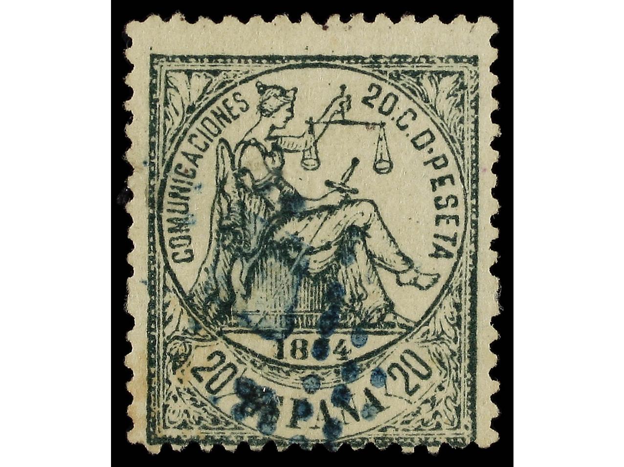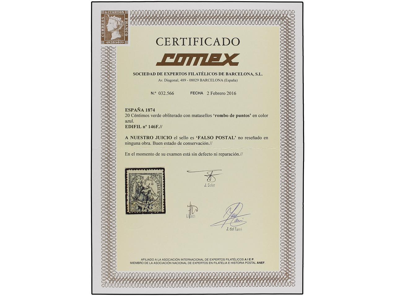 ESPAÑA. 20 cts. verde, FALSO POSTAL. Excepcional y único conocido. No reseñado en ninguna obra. (Graus no reseñado). Cert. COMEX y SORO. Ed.146F.