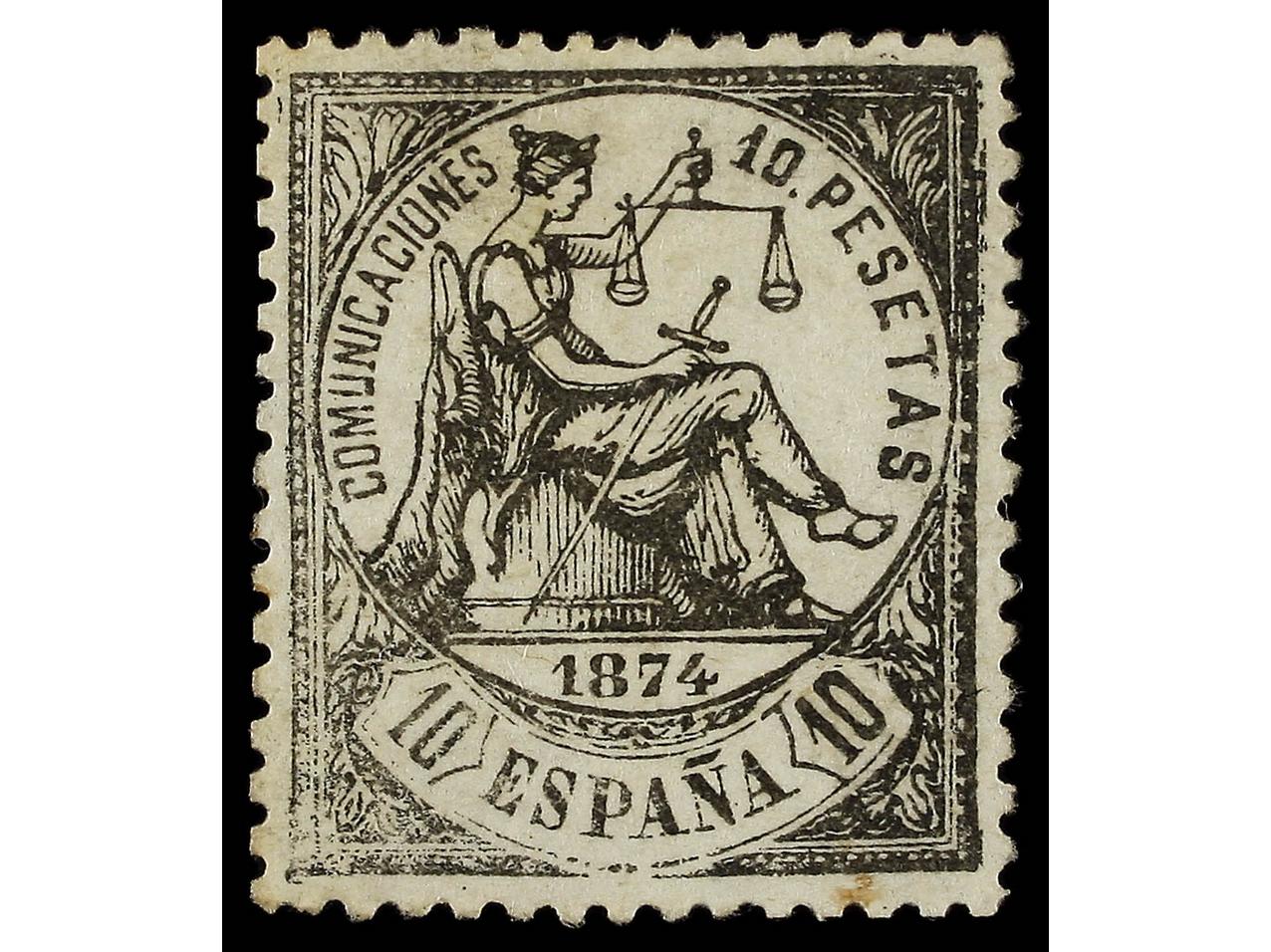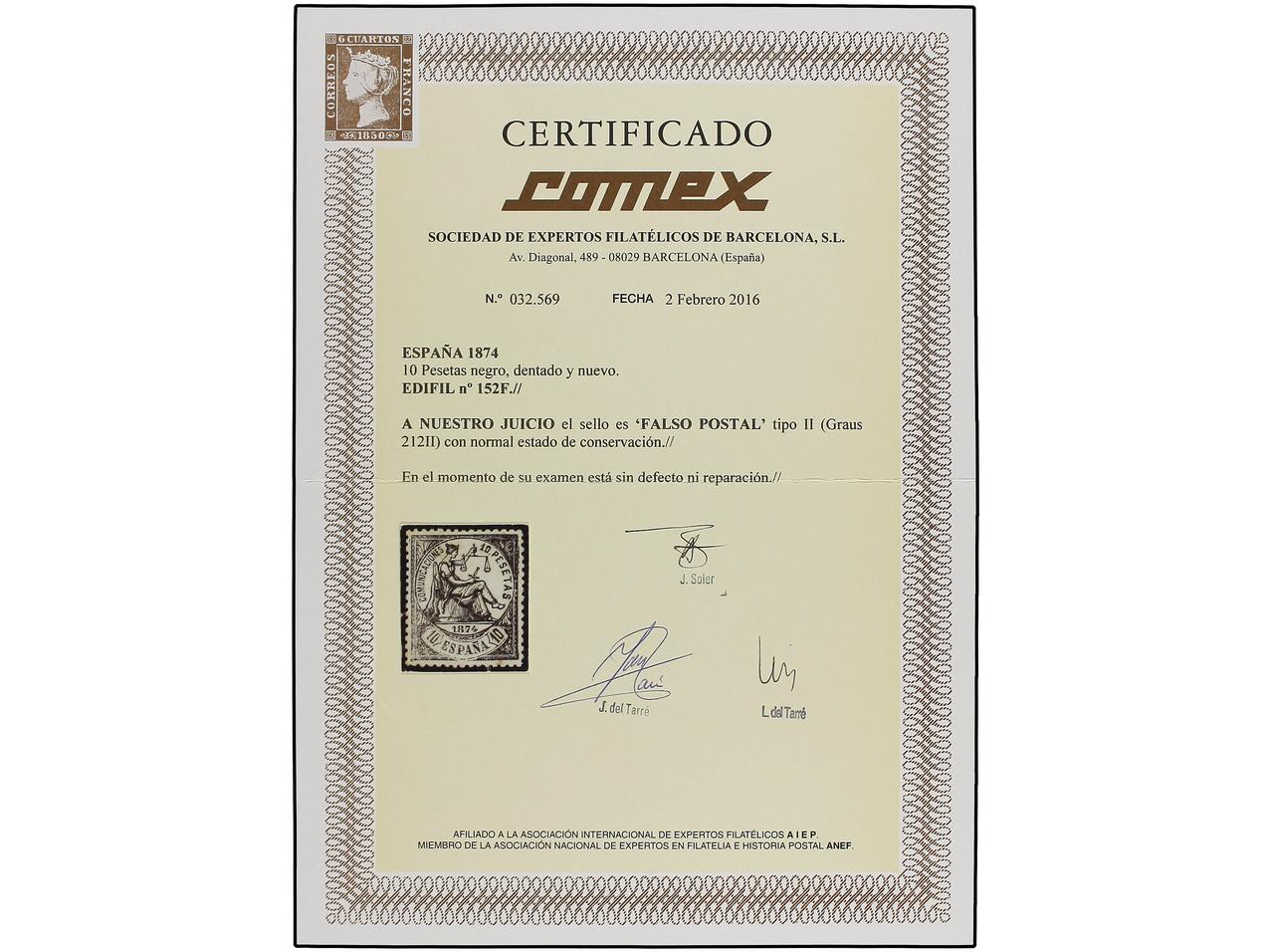 ESPAÑA. 10 pts. negro, FALSO POSTAL, tipo II. MAGNÍFICO EJEMPLAR. MUY RARO. (Graus 212 II). Cert. COMEX y SORO. Ed.152F. (Image1) (Image2)