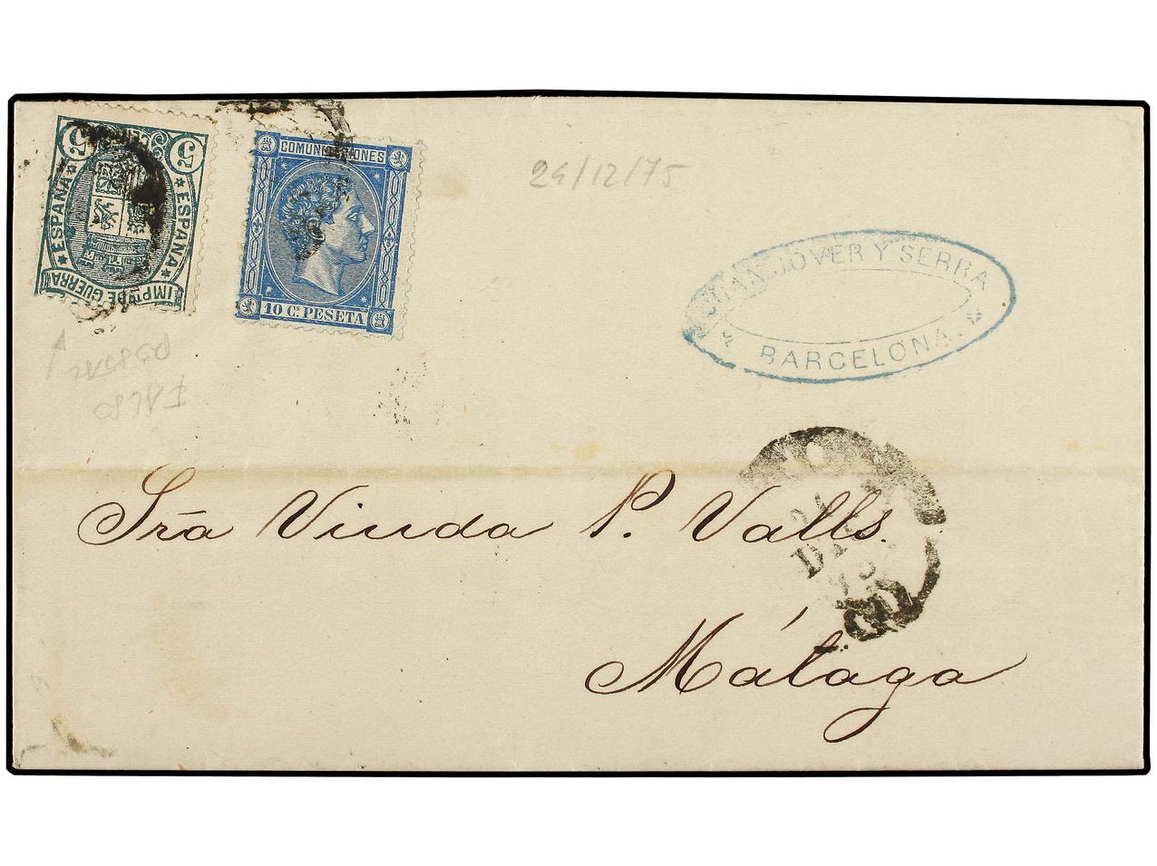 ESPAÑA. 1875. BARCELONA a MALAGA. 10 cts. y 5 cts. verde IG. FALSO POSTAL. Raro en carta. Ed.154F, 164. (Image1) (Image2)