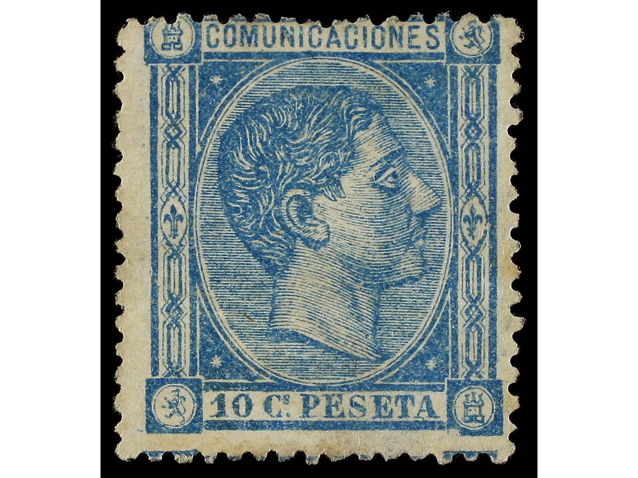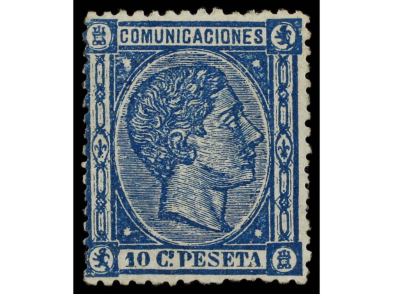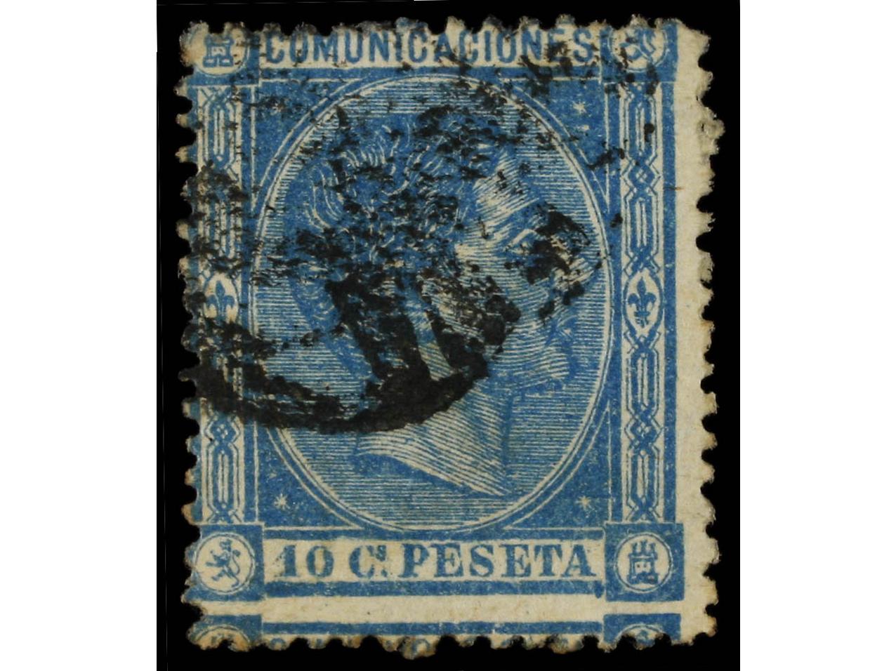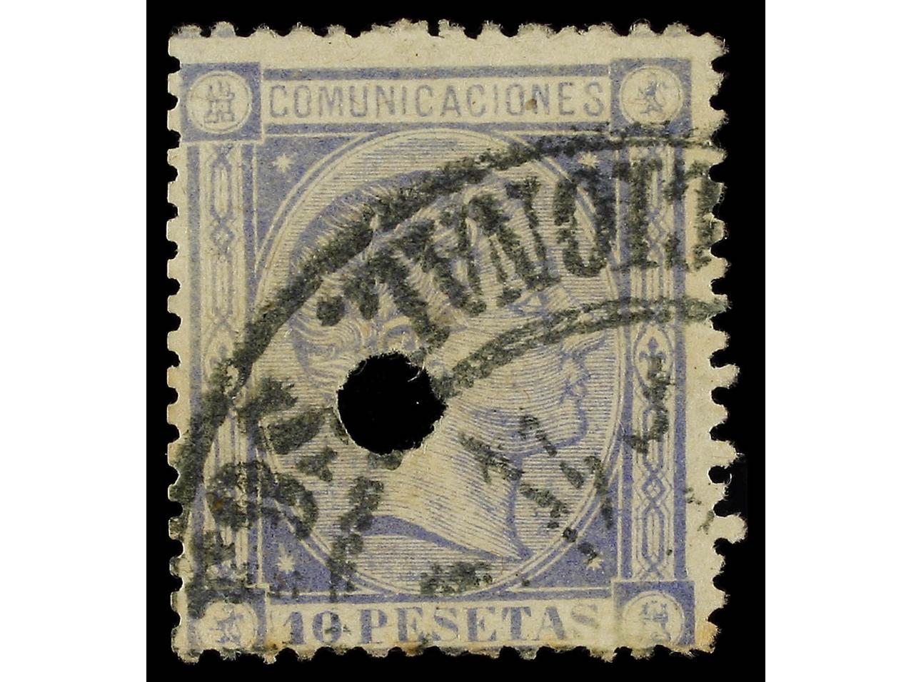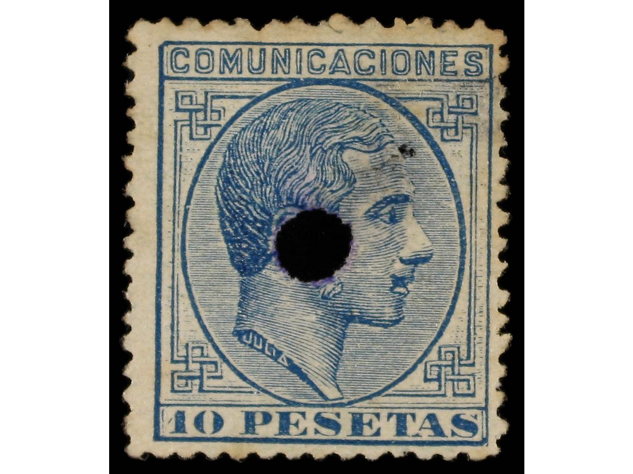 ESPAÑA. 10 pts. azul (Gr. 277). Taladrado. RARO. Cert. SORO. Ed.199F. (Image1)