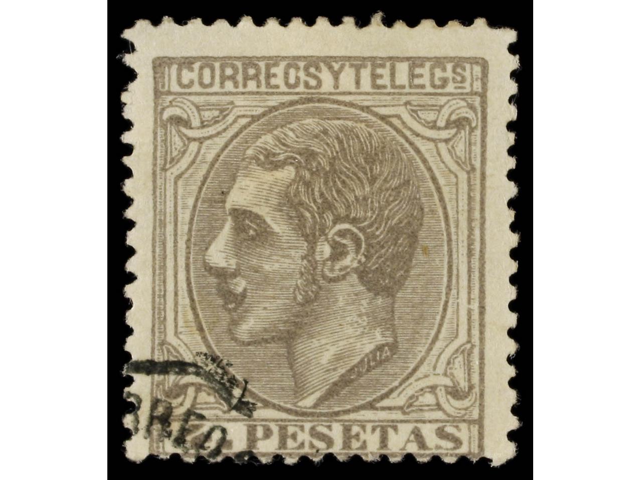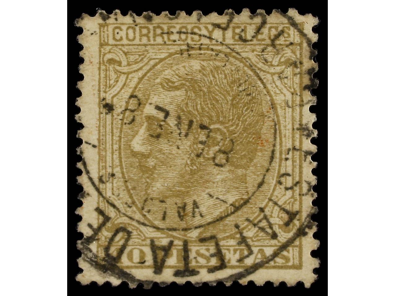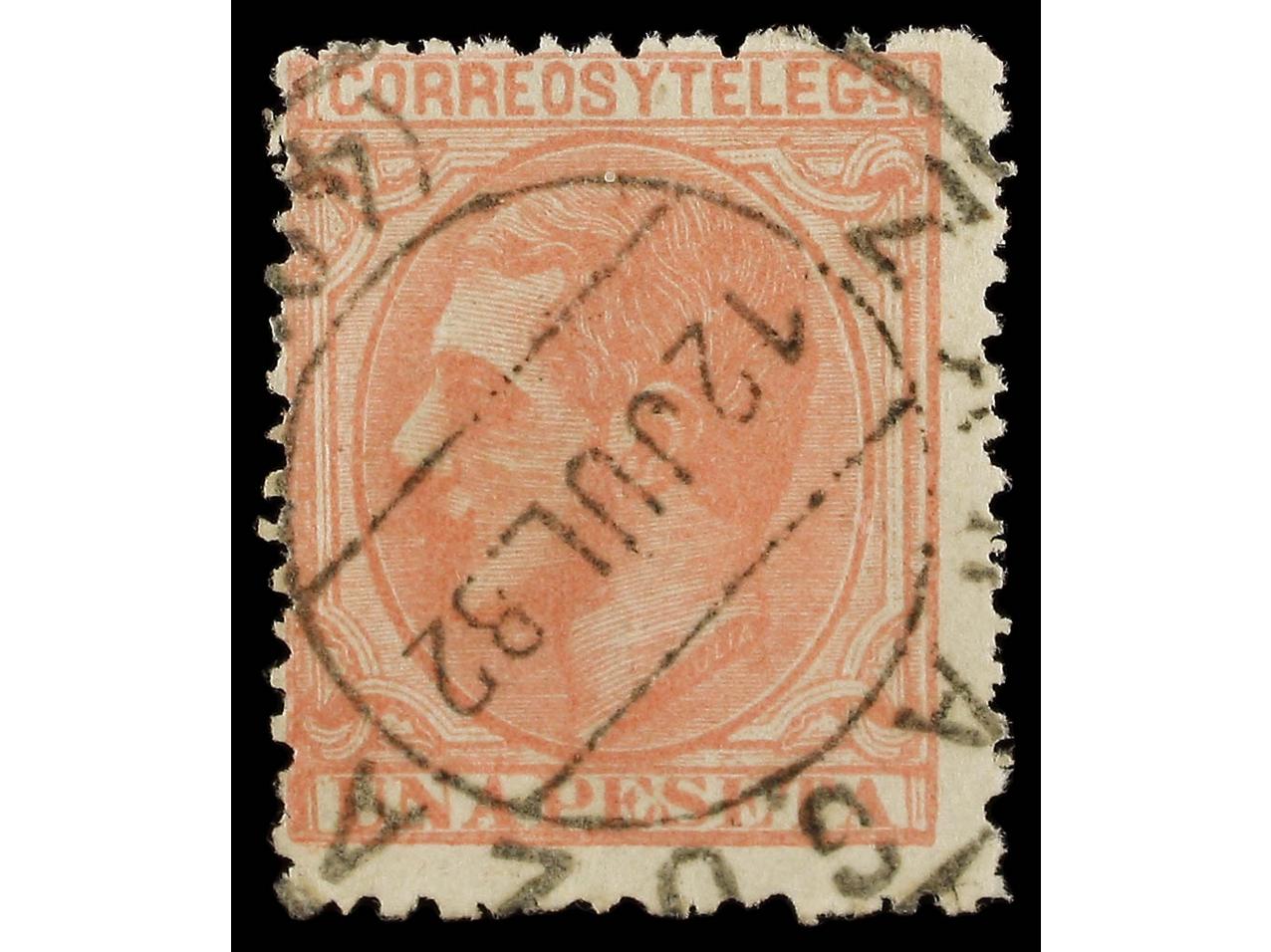 ESPAÑA. 1 pta. rosa, FALSO POSTAL, tipo I (Graus 285I), mat. FECHADOR de ZARAGOZA. RARO. Ed.207F. (Image1)