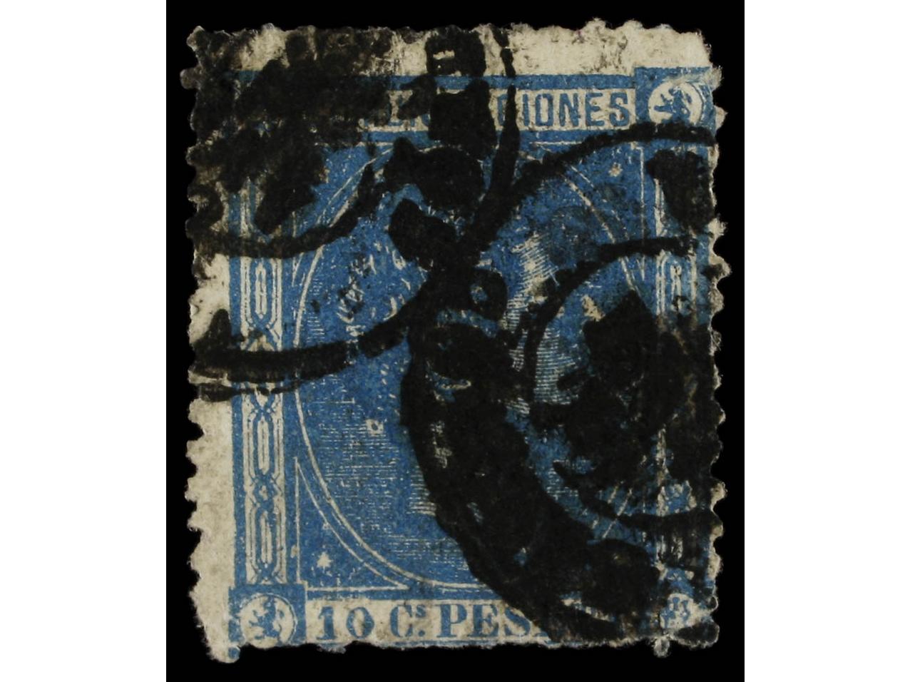 ESPAÑA. 10 cent. azul, FALSO POSTAL, tipo III. EXTRAORDINARIAMENTE RARO, probablemente único ejemplar conocido. F. E. SORO. (Graus 234 III). Cert. COMEX. Ed.164F. (Image1) (Image2)