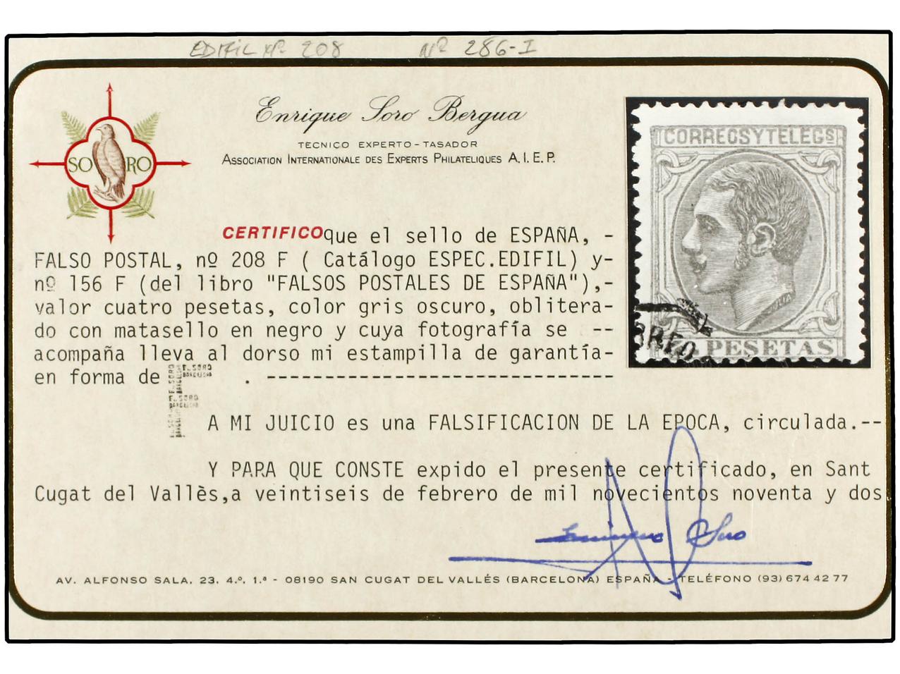 ESPAÑA. 4 pts. gris. FALSO POSTAL. Cert. E. SORO. Ed.208F. (Image1)
