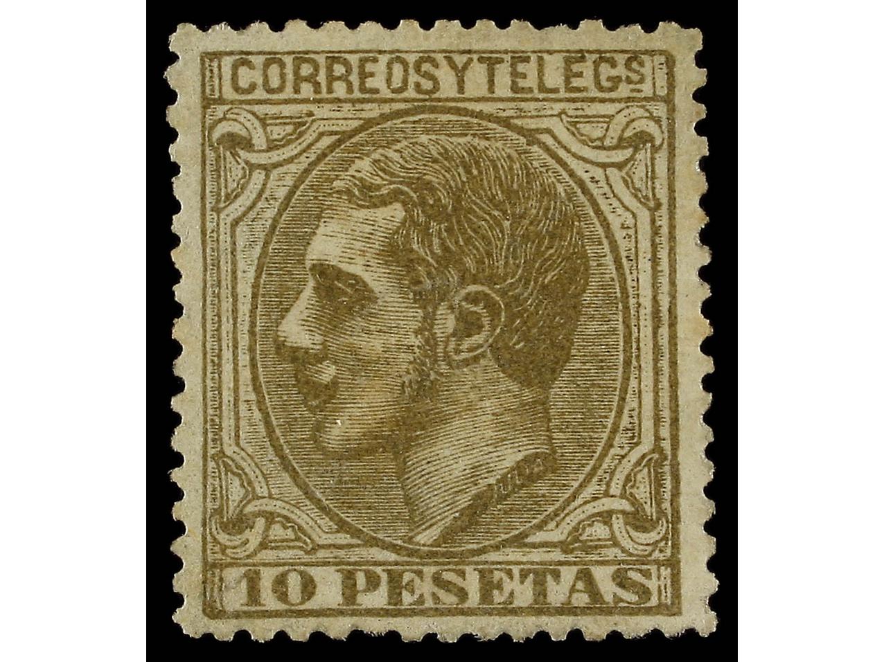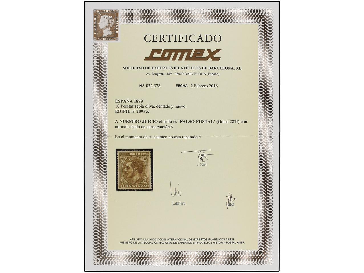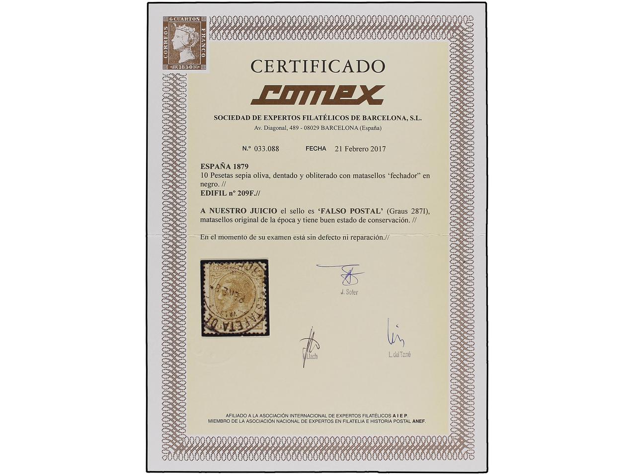 ESPAÑA. 10 pts. sepia oliva, FALSO POSTAL. Rarísimo en nuevo. Ex. Col. F. GRAUS. (Graus 287 I). Cert. COMEX. Ed.209F. (Image1) (Image2)