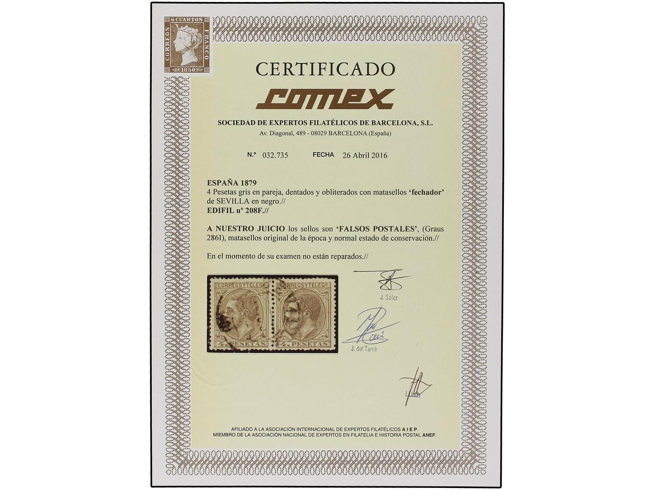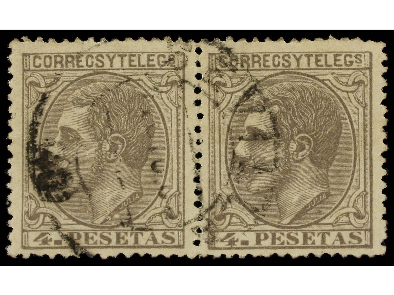 ESPAÑA. 4 pts. gris. FALSO POSTAL en pareja. Mat. fechador de SEVILLA. MUY RARO en usado, único múltiple conocido (Graus 286 I). Cert. COMEX. Ed.208F (2).