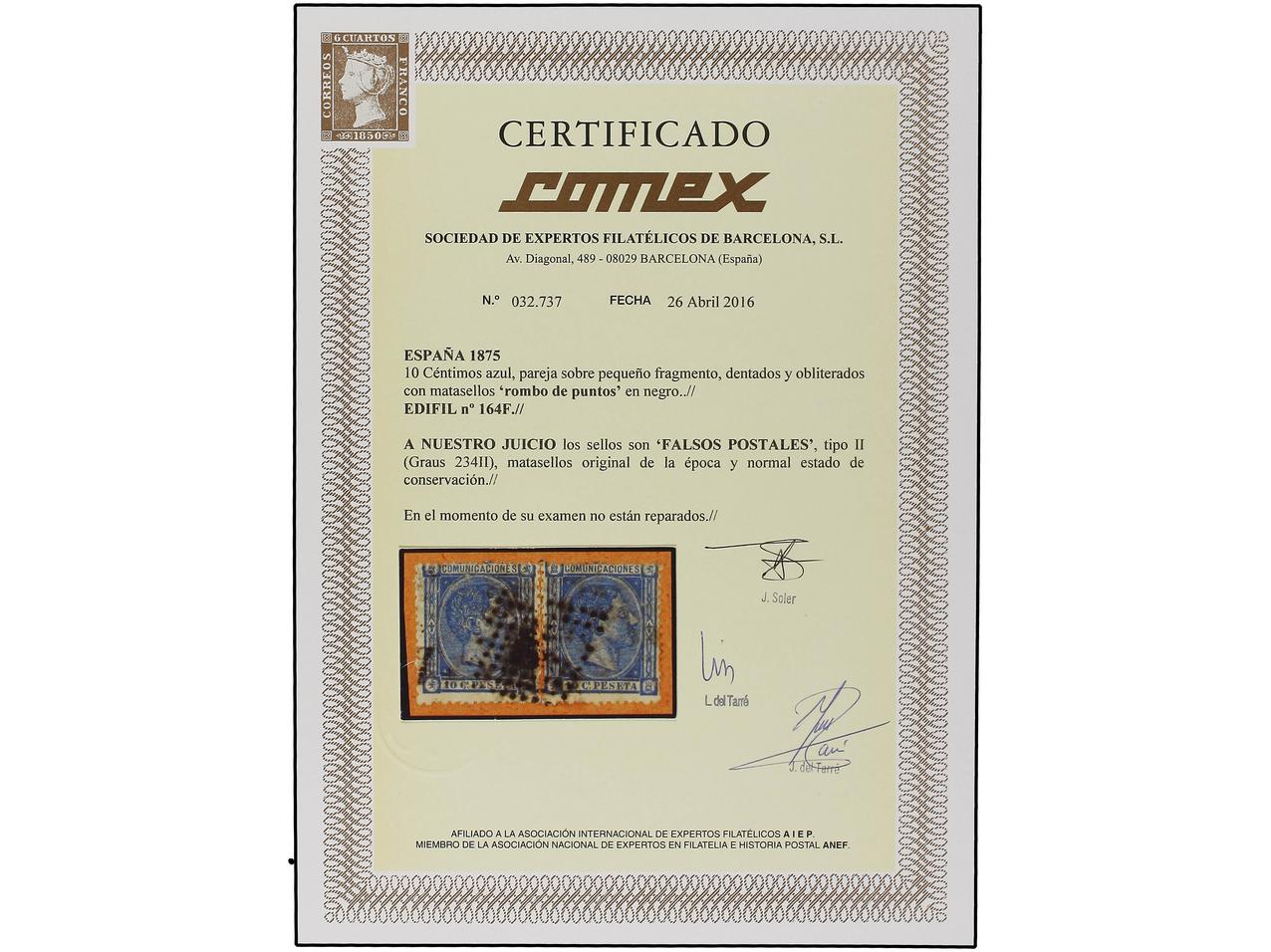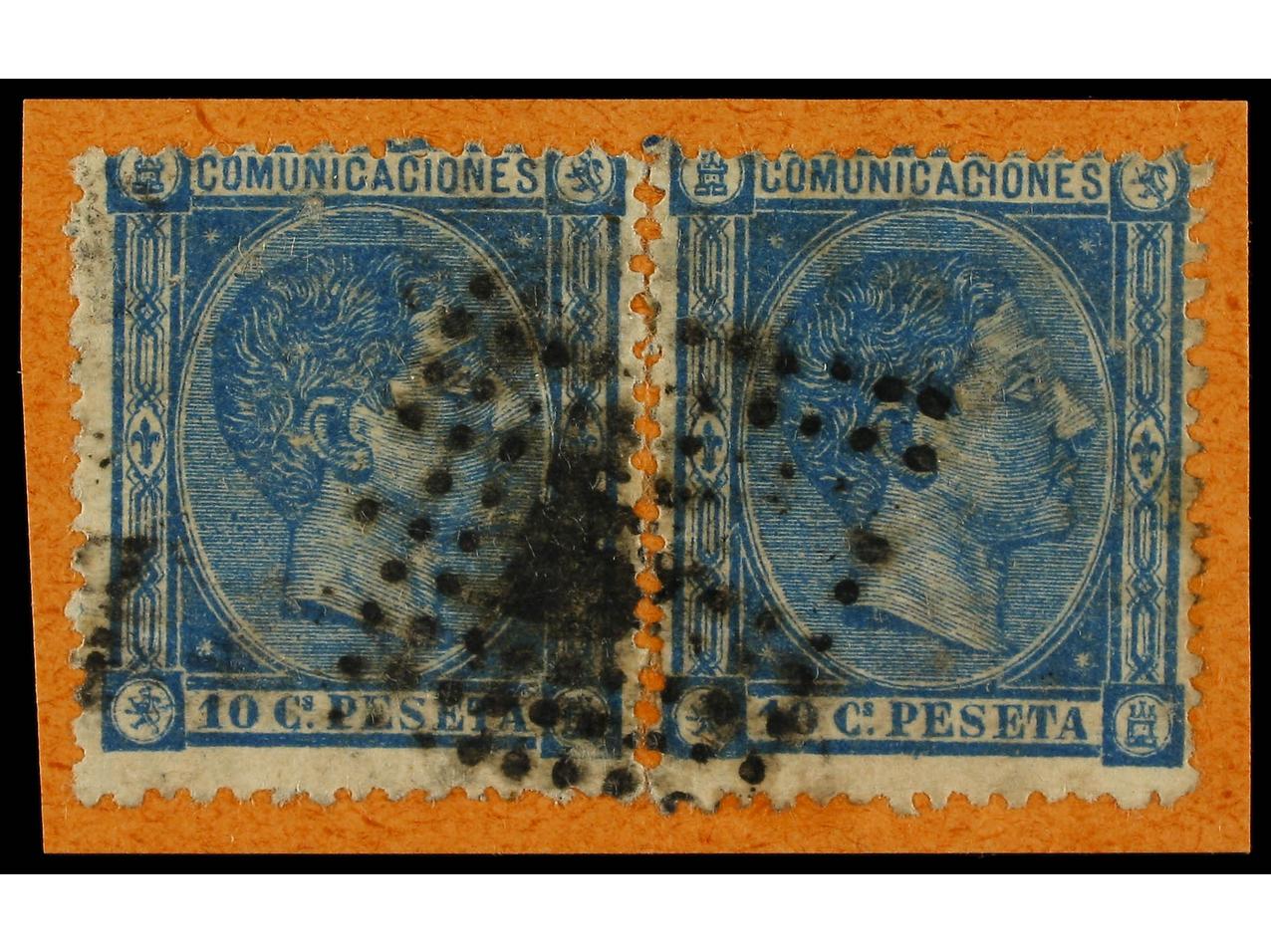 ESPAÑA. 10 cent. azul. FALSO POSTAL tipo II. Dos sellos sobre pequeño fragmento. Mat. rombo de puntos. MUY RARO. (Graus 234 II). Cert. COMEX. Ed.164F.