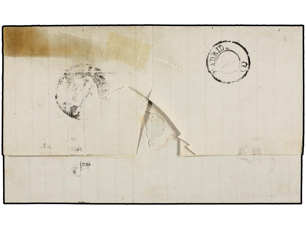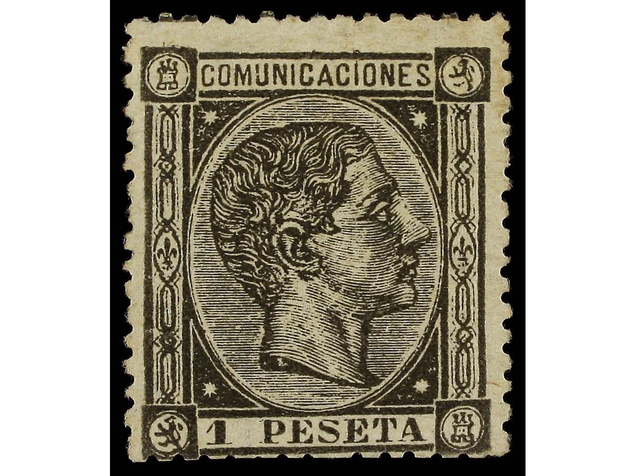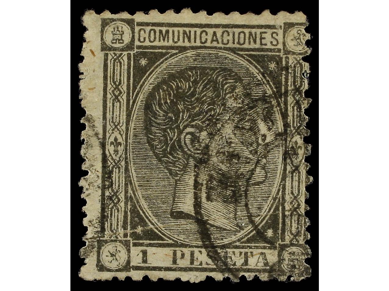 ESPAÑA. 1 pta. negro, FALSO POSTAL, tipo I. EXTRAORDINARIAMENTE RARO. Único ejemplar conocido. Ex. Col. GRAUS. F. ROIG. (Graus 239 I). Cert. COMEX. Ed.169F.