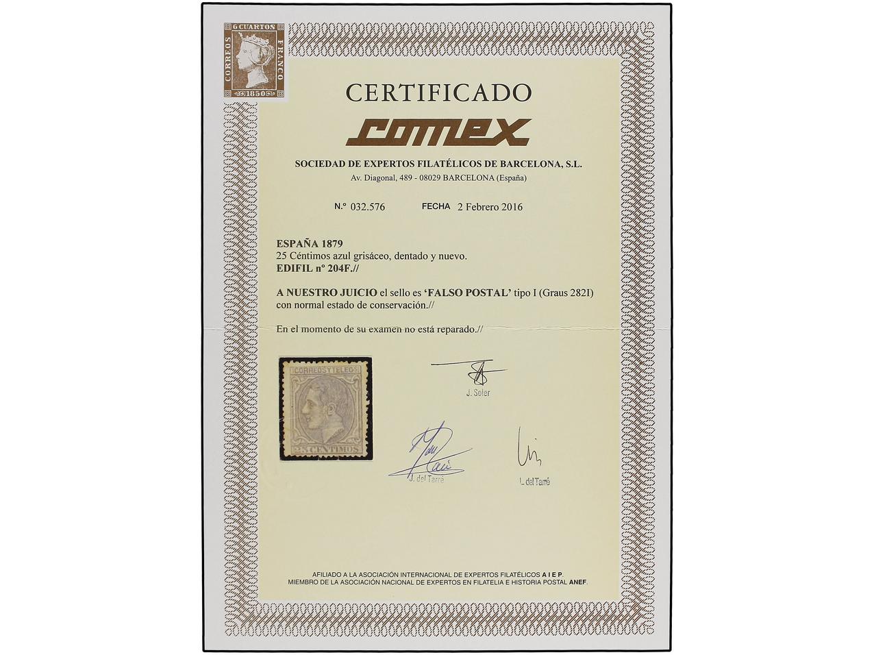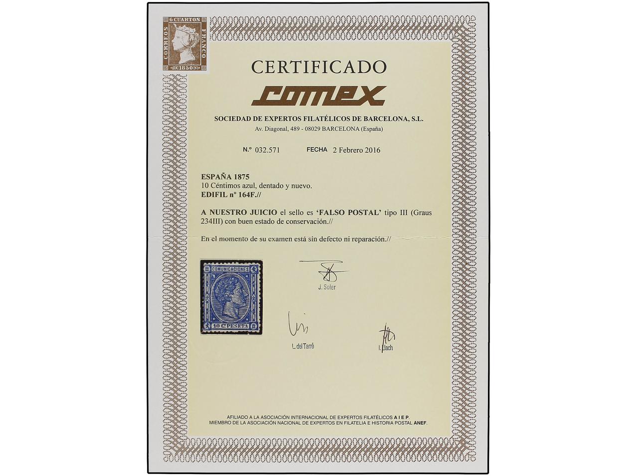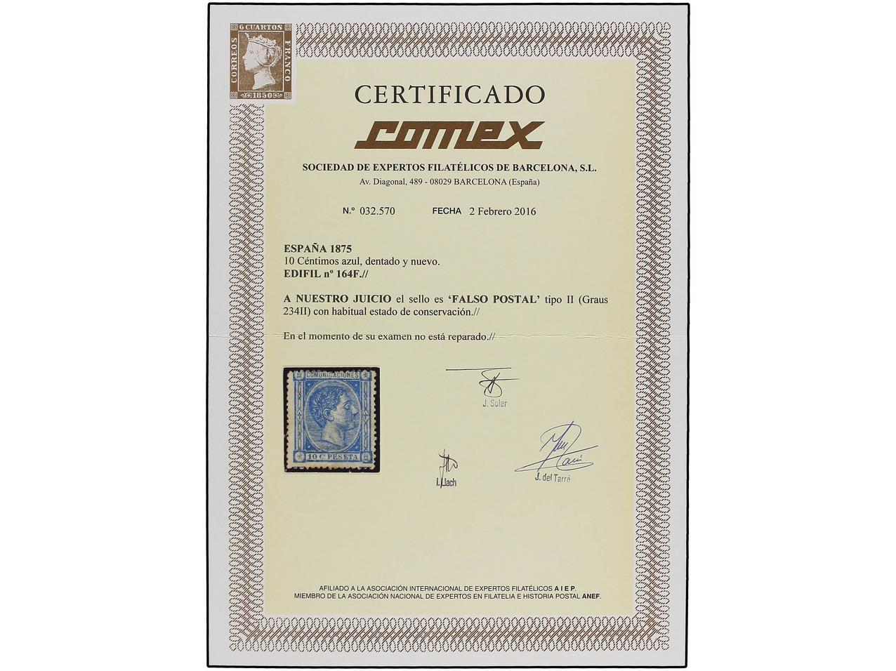 ESPAÑA. 10 cent. azul, FALSO POSTAL, tipo II. RARÍSIMO en nuevo. (Graus 234 II). Cert. COMEX. Ed.164F. (Image1) (Image2)