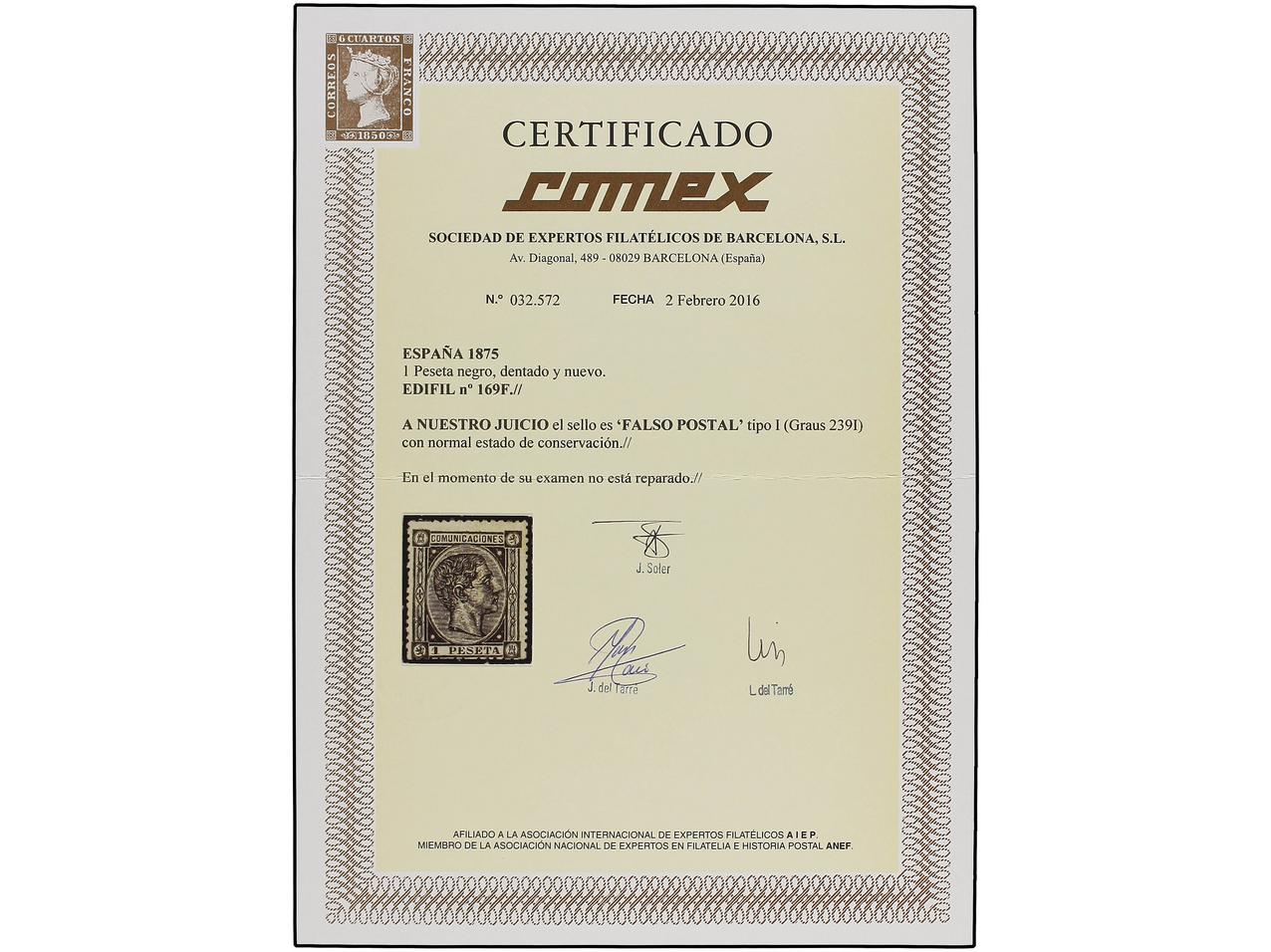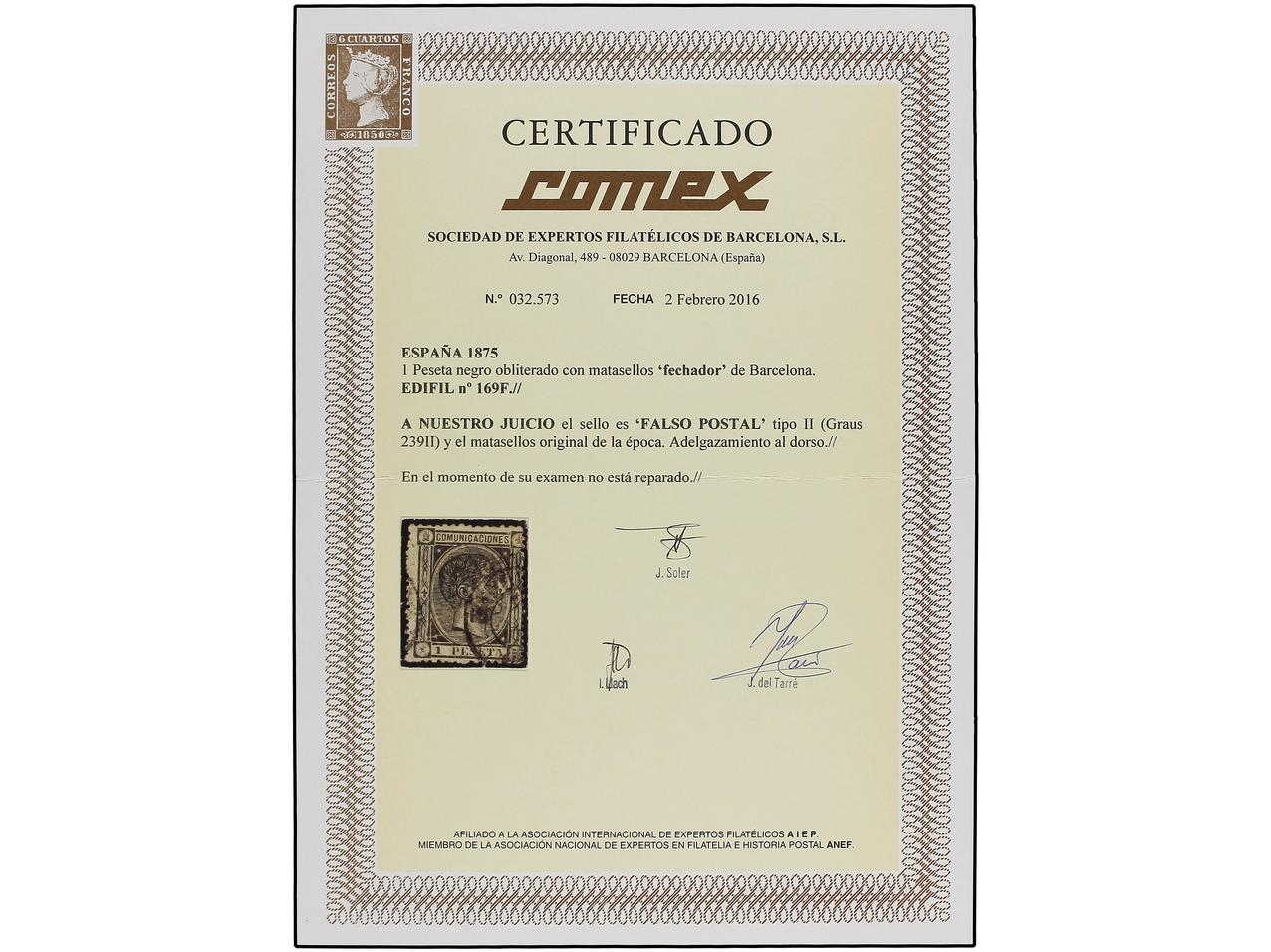 ESPAÑA. 1 pta. negro, FALSO POSTAL, tipo II, matasellos FECHADOR de Barcelona. Adelgazamiento al dorso. RARÍSIMO, muy pocos ejemplares conocidos. F.E. SORO. (Graus 239 II). Cert. COMEX. Ed.169F. (Image1) (Image2)