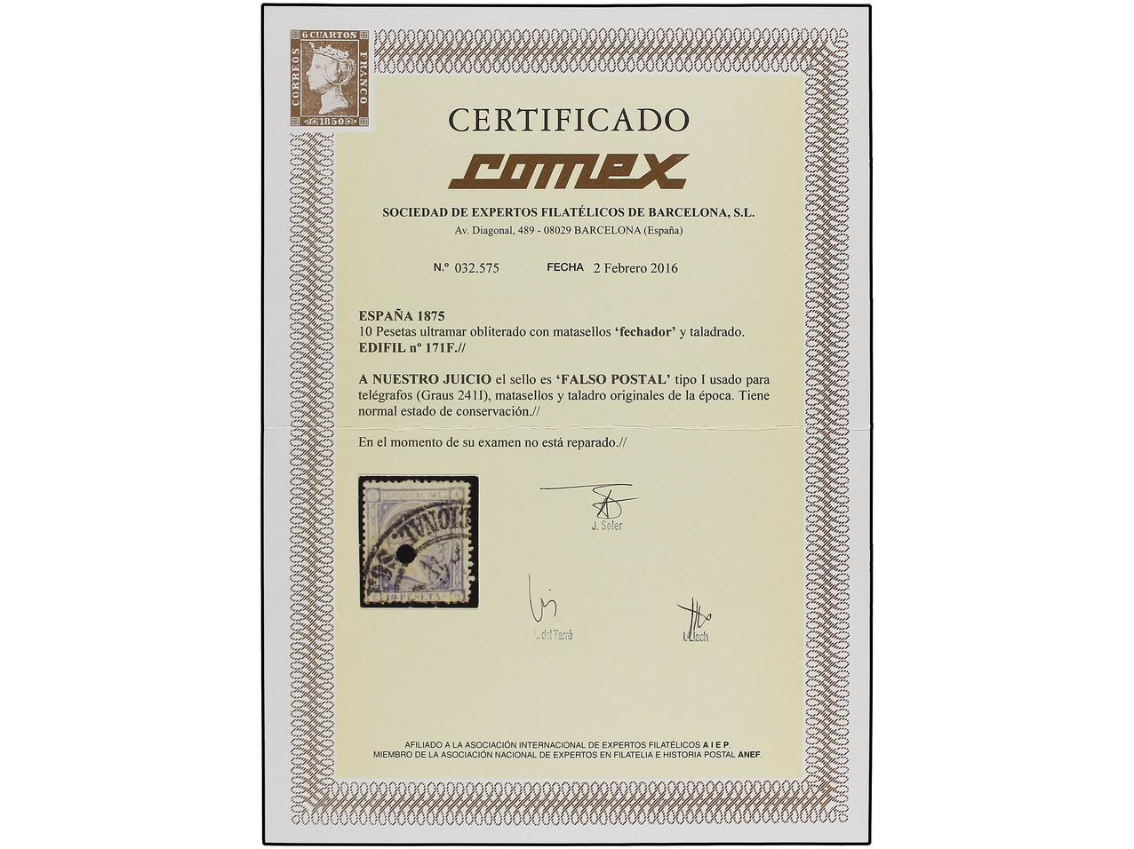 ESPAÑA. 10 pts. azul, FALSO POSTAL, tipo I, usado para telégrafos. EXTRAORDINARIAMENTE RARO. Ex. col. F. GRAUS. F. E. SORO. (Graus 241 I). Cert. COMEX. Ed.171F.