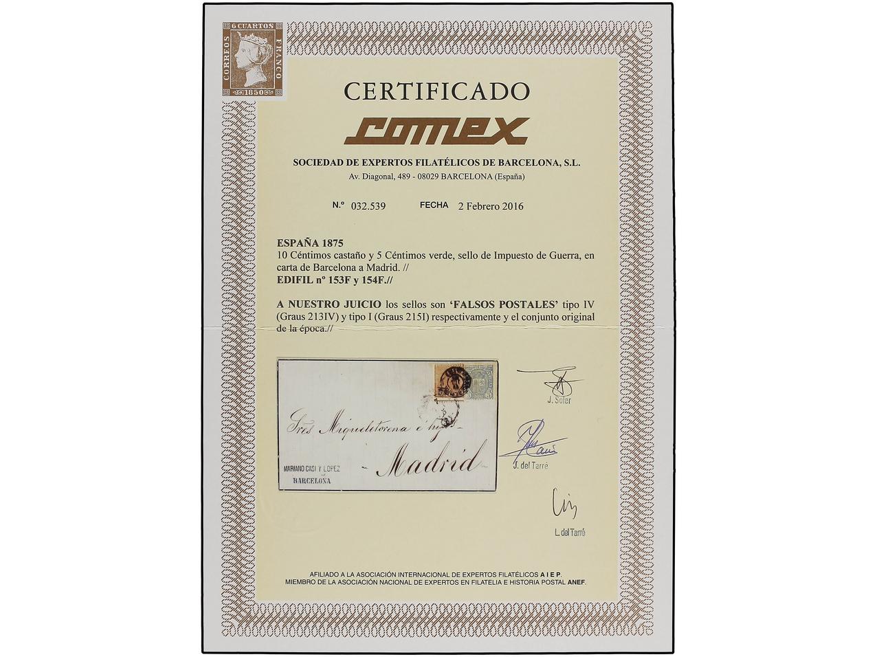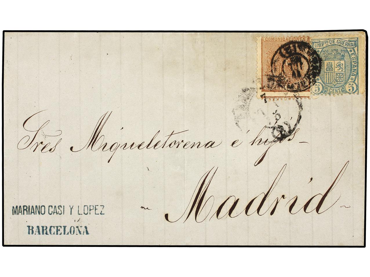 ESPAÑA. 1875. BARCELONA a MADRID. 10 cts. castaño. FALSO POSTAL tipo IV y 5 cts. de Imp. de Guerra FALSO POSTAL tipo I. MUY RARA. (Graus 213 IV, 215 I). Cert. COMEX. Ed.153F, 154F. (Image1) (Image2)