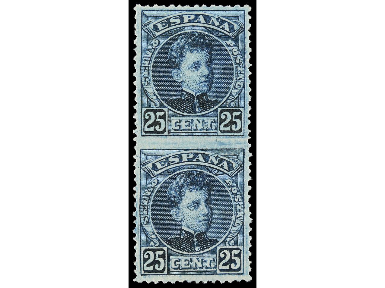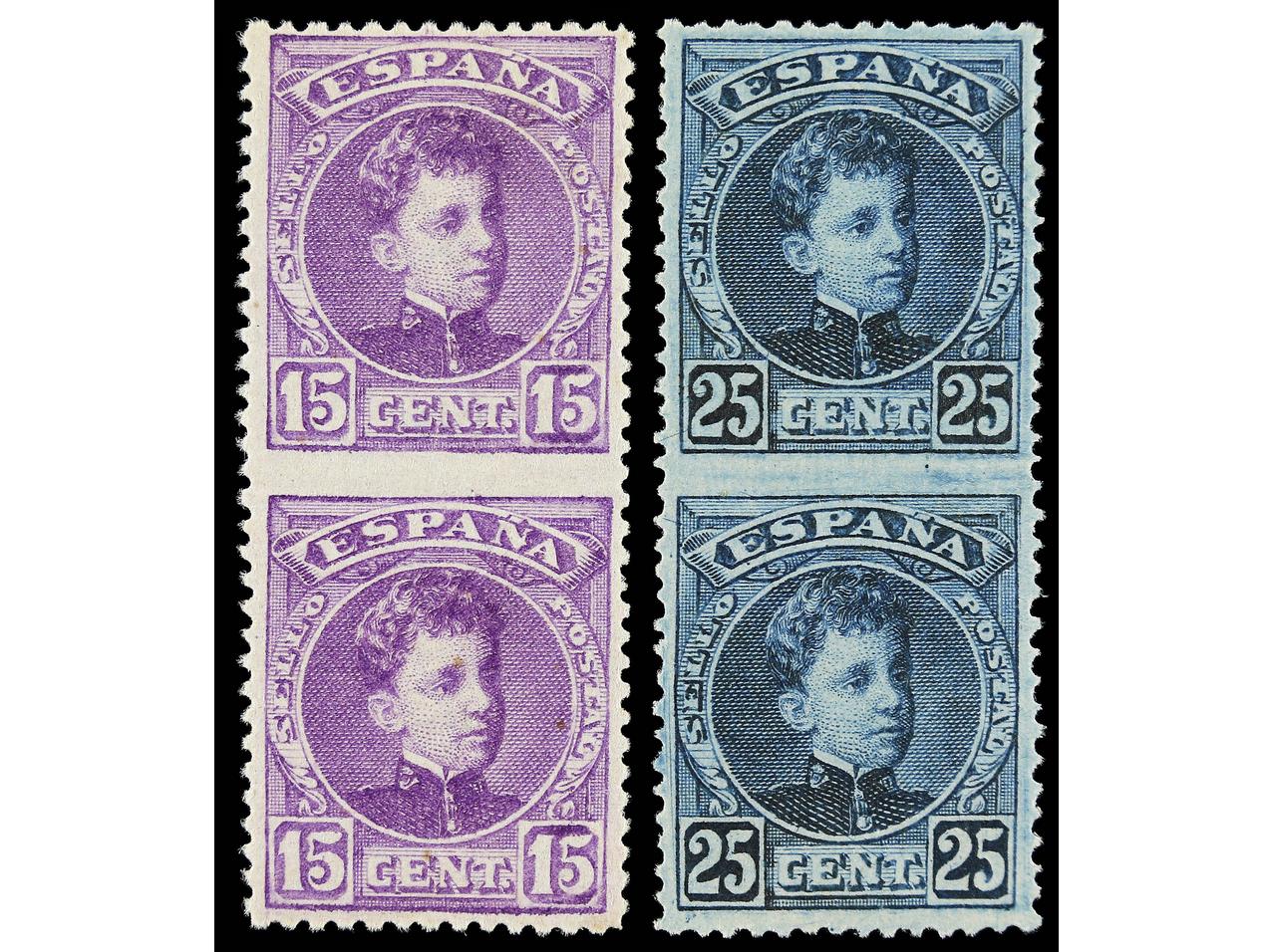 ESPAÑA. 15 cts. violeta y 25 cts. azul. Parejas verticales SIN DENTAR EN MEDIO. PRECIOSAS y RARA. Ed.246spv, 247spv. (Image1) (Image2)