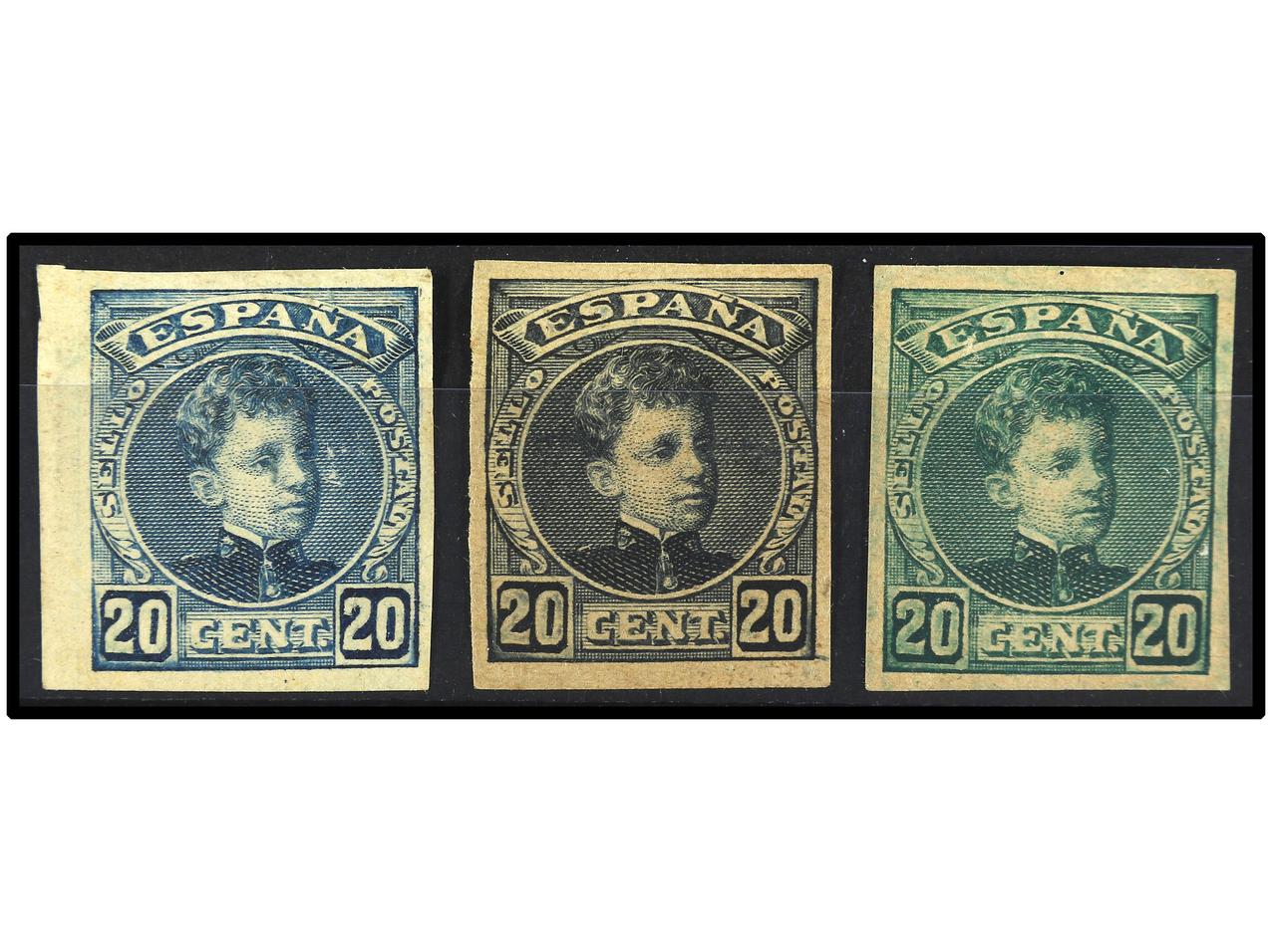 ESPAÑA. ENSAYOS DE COLOR. 20 cts. azul oscuro, 20 cts. negro y 20 cts. verde amarillo. Muy bonitos. Ed.247 (3). (Image1)