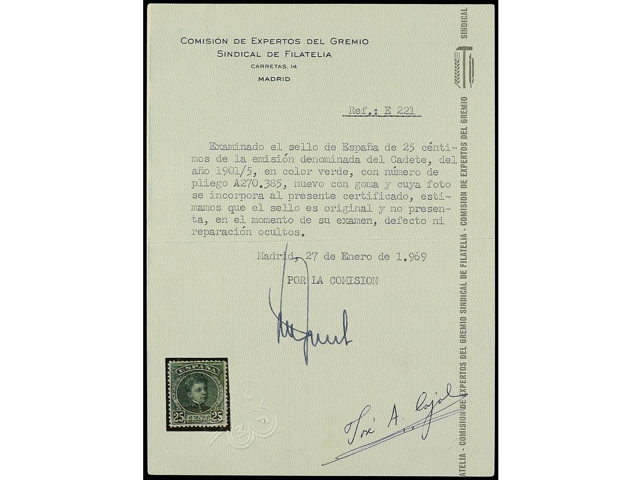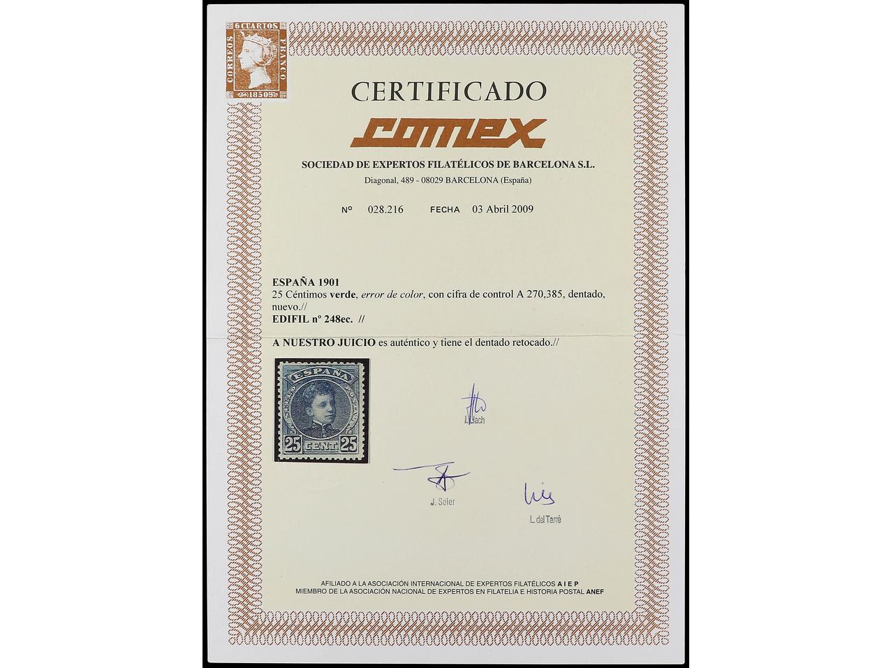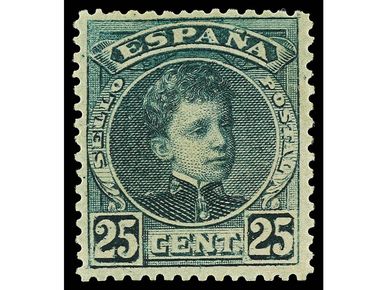 ESPAÑA. 25 cts. verde ERROR DE COLOR al dorso numeración A270.385, margen superior dentado levemente retocado. Sello de excepcional rareza, según el catálogo Edifil sólo existen 7 ejemplares. Uno de los sellos más raros del siglo XX