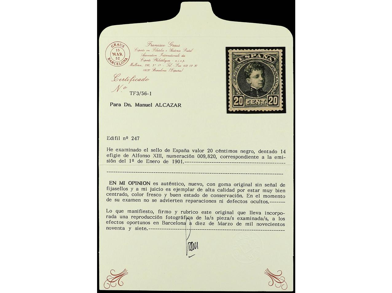 ESPAÑA. 20 céntimos negro. PIEZA DE LUJO. Cert. GRAUS. Ed.247. (Image1) (Image2)