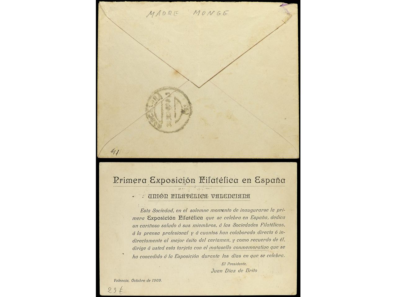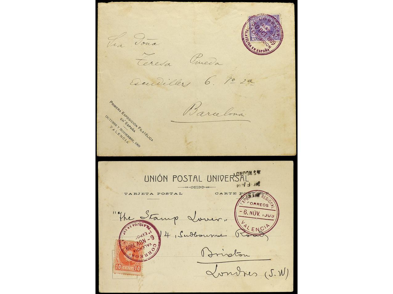 ESPAÑA. 1909. Carta y tarjeta postal con sello de 15 cts. violeta y 10 cts. con mat. especial 1ª EXPOSICIÓN FILATÉLICA EN ESPAÑA/ VALENCIA. Ed.243, 246.