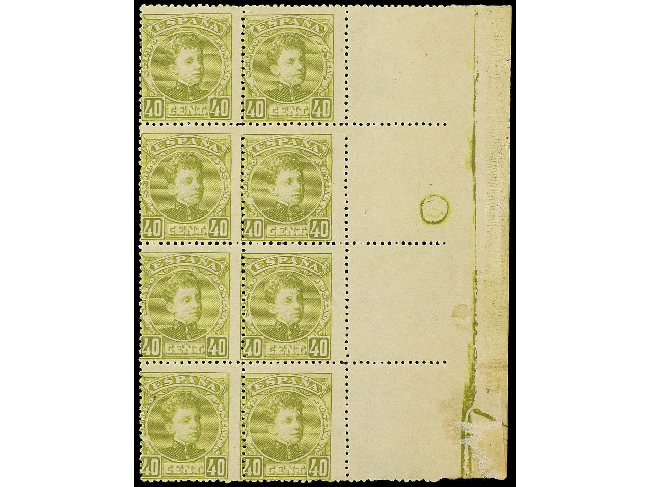 ESPAÑA. 40 cts. oliva. Bloque de ocho, sello muy raro sin fijasellos. Ed.250 (8). Cat. 1.720€. (Image1)