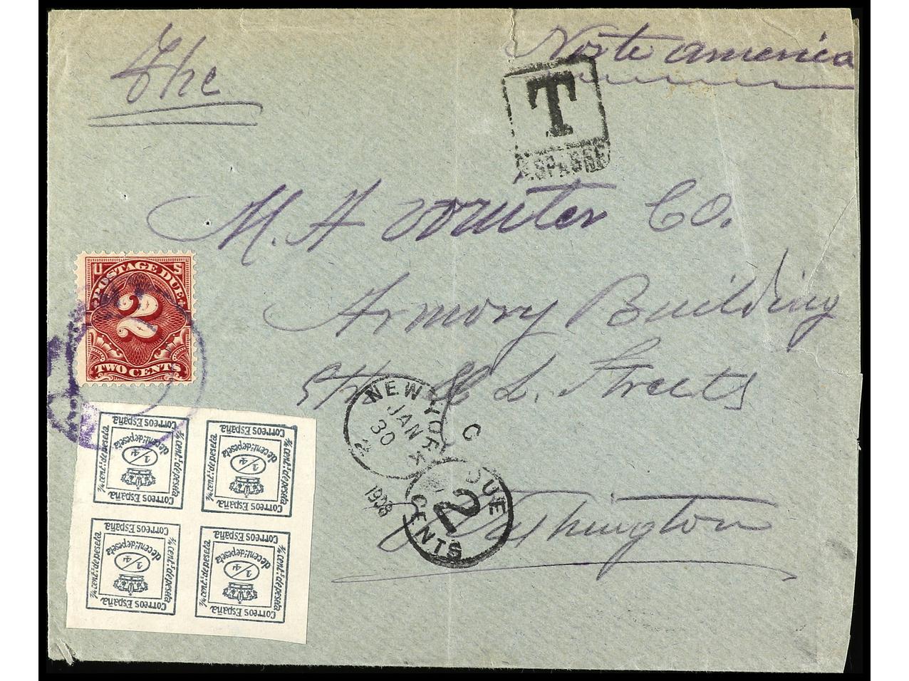 ESPAÑA. 1908. Impreso circulado a U.S.A con sello de 4/4 cto. verde, tasado a la llegada con sello US de 2 cts. carmín. MUY RARA combinación de franqueo.