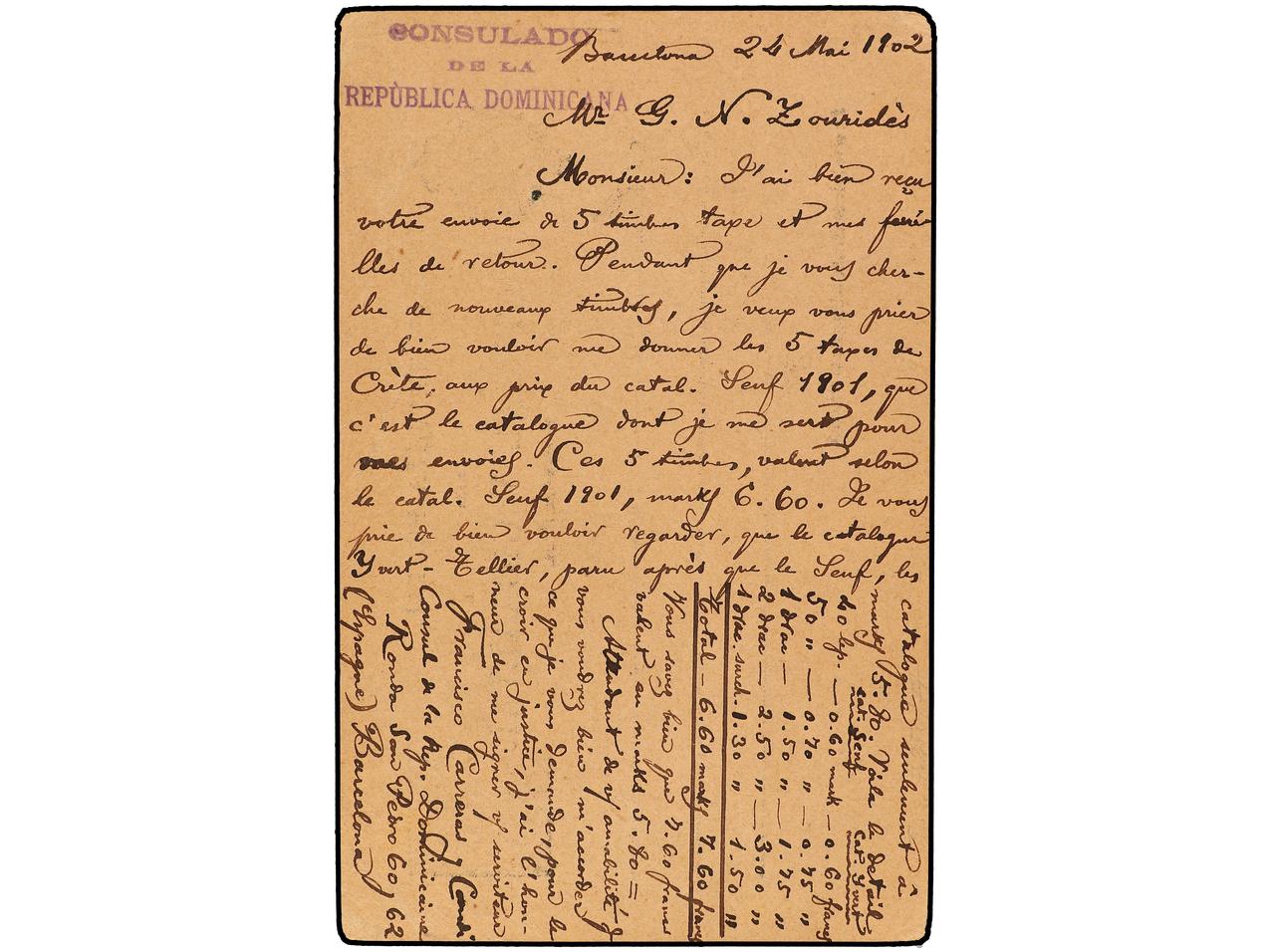 ESPAÑA. 1902. BARCELONA a LA CANÉE (Creta). 5 cts. verde con franqueo adicional de 2 cts. castaño, dos sellos y uno bisectado. Escrita por Carreras Candi. RARA destinación y franqueo. Ed.34. (Image1) (Image2)