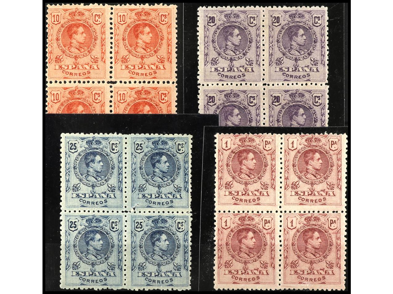 ESPAÑA. Conjunto de bloques de cuatro. Sellos inferiores sin fijasellos. Ed.269, 273, 274, 278. (Image1)