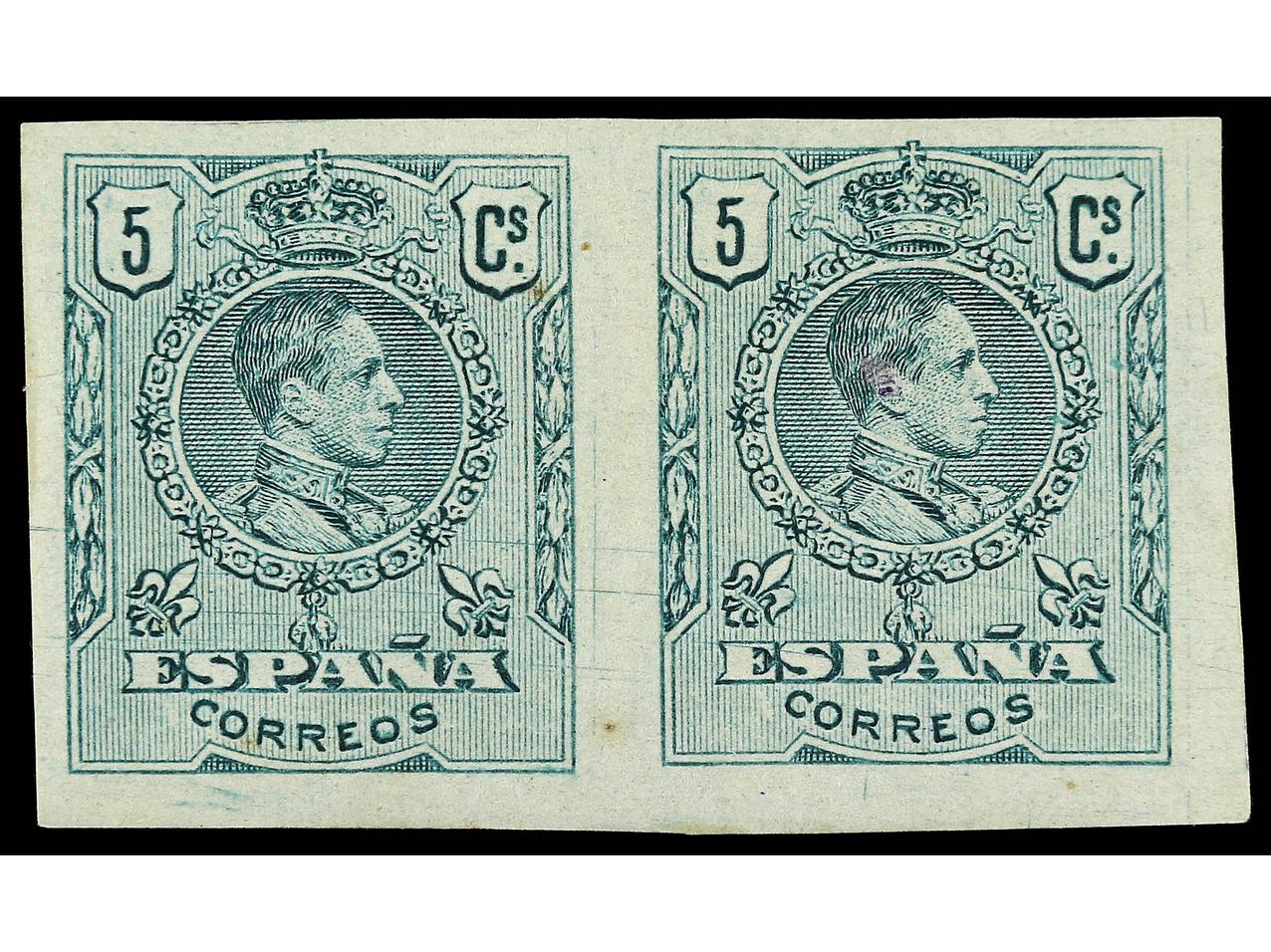 ESPAÑA. 5 cts. verde. Pareja SIN DENTAR al dorso numeración auténtica B639,379. Ed.268s (2). Cat. 460€. (Image1)