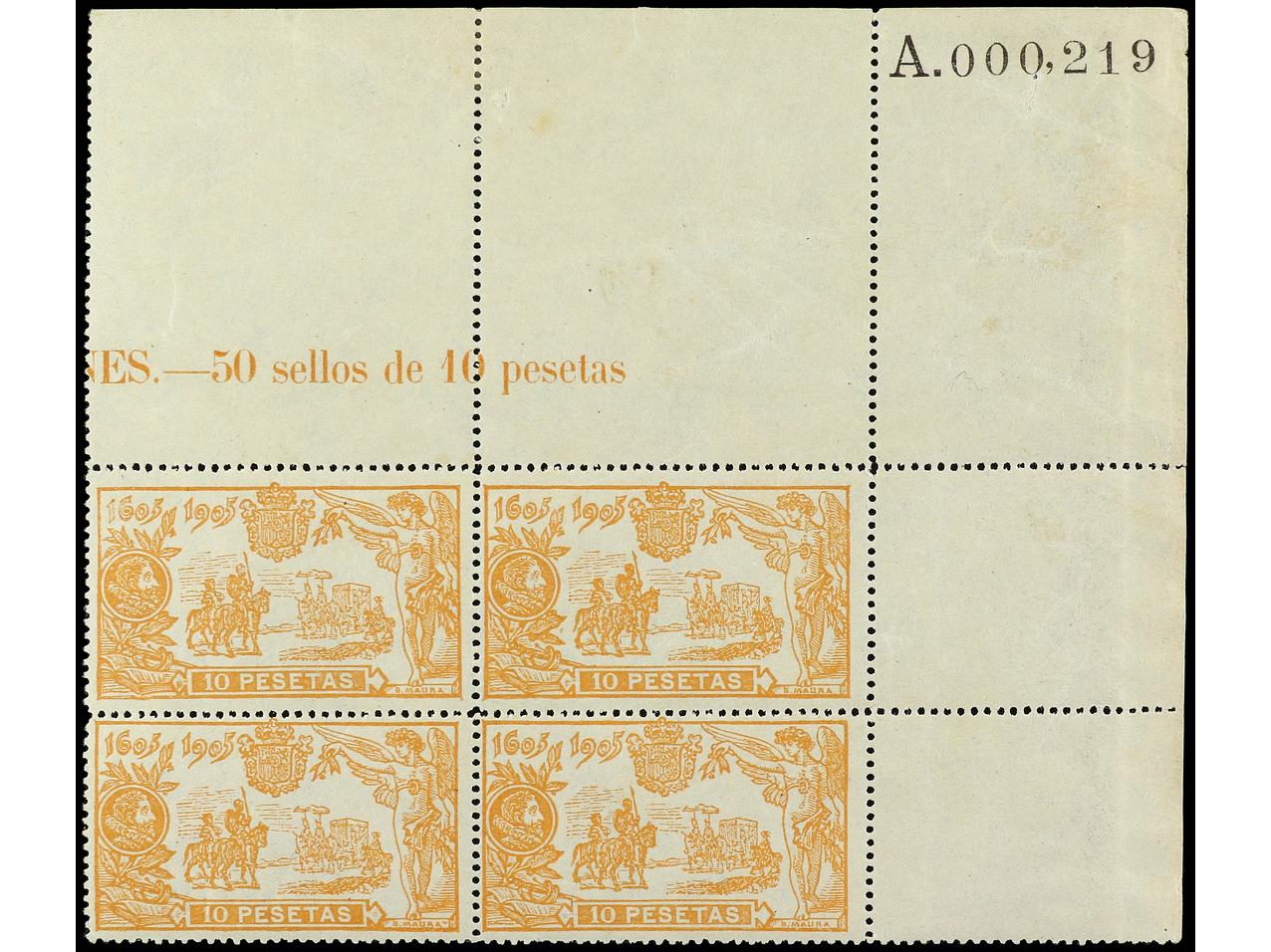 ESPAÑA. 4 pts. naranja. Bloque de cuatro, esquina de hoja con nº. LUJO. Ed.266 (4). Cat. +1.680€. (Image1)