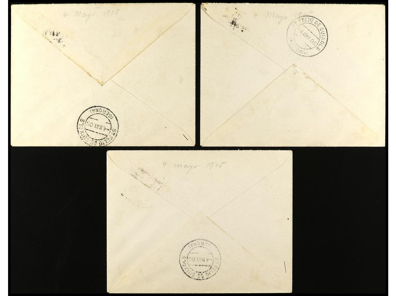 ESPAÑA. 1905. Tres cartas con sellos de 50 cts. azul, 4 pts. violeta y 10 pts. naranja. Se trata de franqueos filatélicos aunque tengan fechador de llegada a S. Feliu de Guixols al dorso. Ed.263, 265 y 266. (Image1) (Image2)