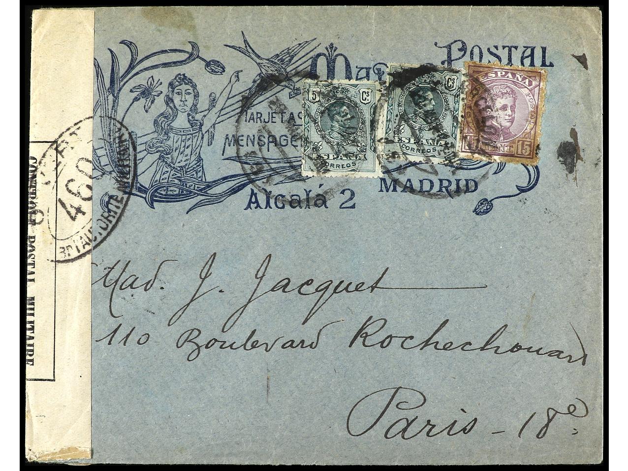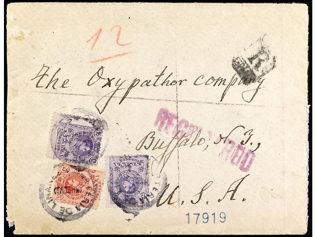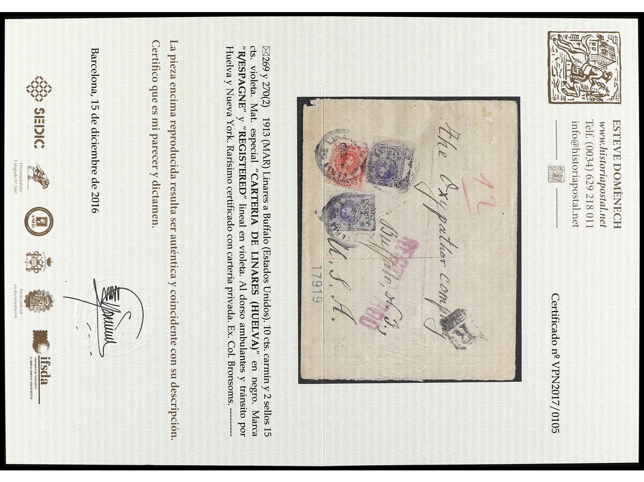 ESPAÑA. 1913. LINARES (Huelva) a U.S.A 10 cts. rojo y 15 cts. violeta mat. circular CARTERÍA DE LINARES. Carta certificada. RARA. Ed.269, 270 (2).