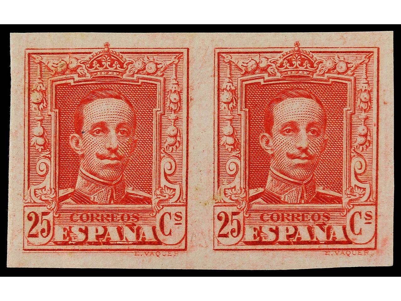 ESPAÑA. 25 cts. rojo. Pareja SIN DENTAR. Al dorso numeración auténtica I 573.266. RARA y de LUJO. Ed.317As. Cat. 302€. (Image1)