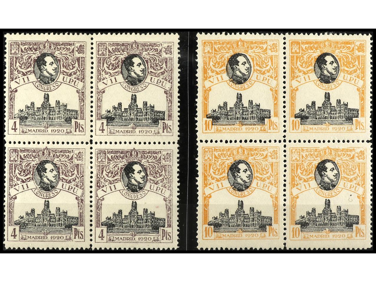ESPAÑA. 4 pts. violeta y 10 pts. naranja. Bloques de cuatro. Centrajes perfectos. LUJO. Ed.308/09. Cat. +3.820€. (Image1) (Image2)