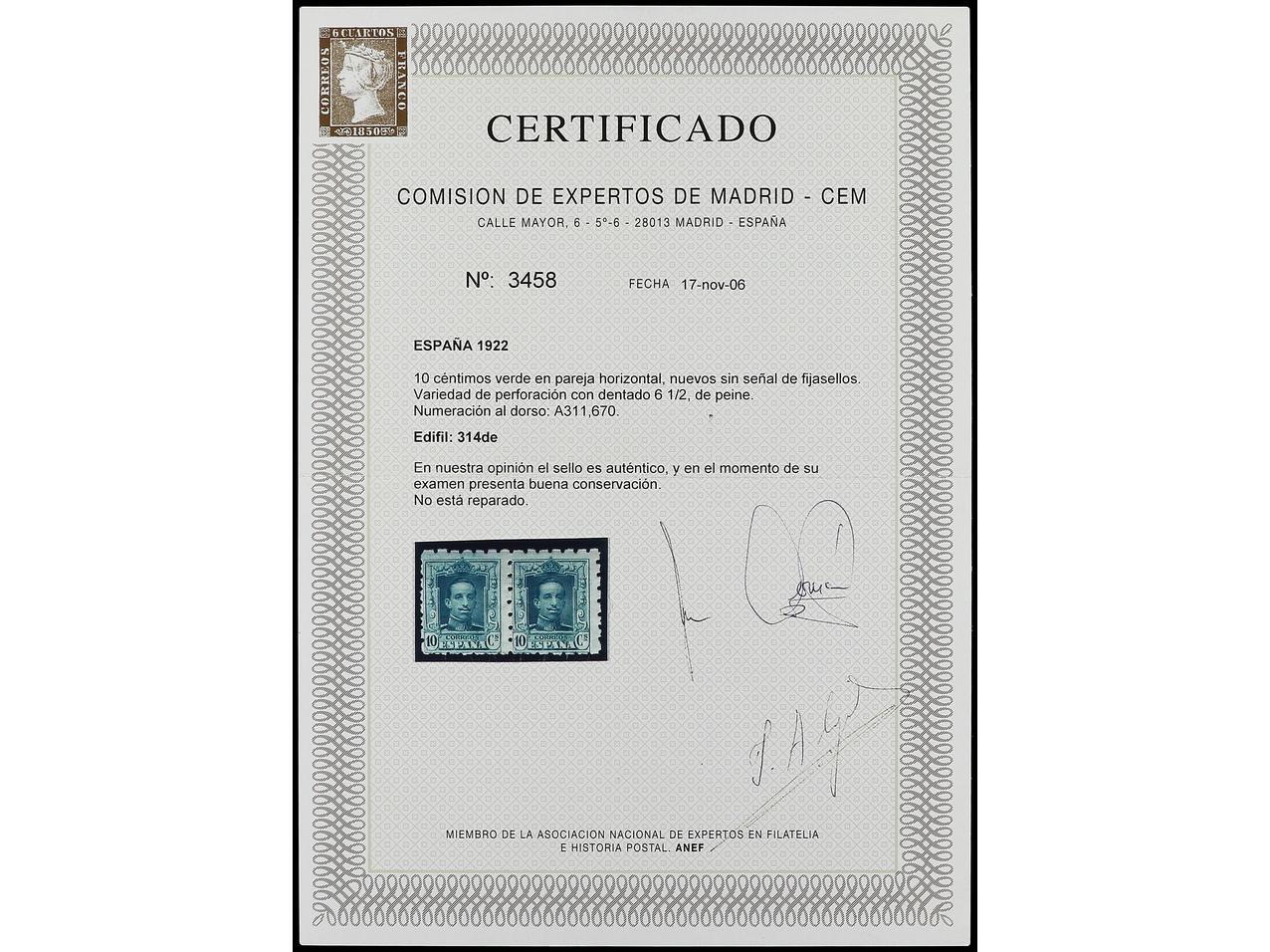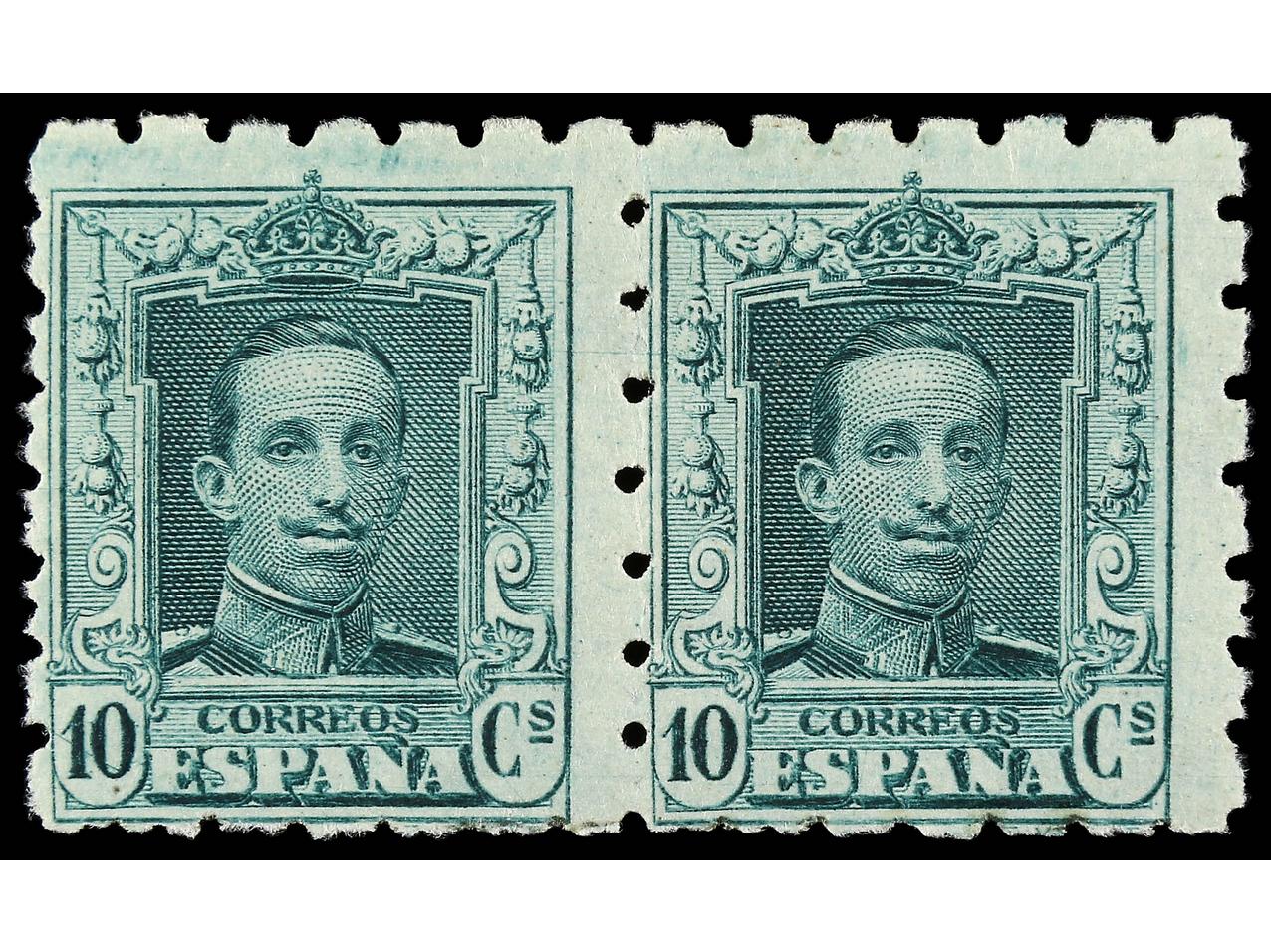 ESPAÑA. 10 cts. verde, dent. 6 1/2. Pareja. MAGNÍFICA y RARA. Cert. CEM. Ed.314de. Cat. 220€. (Image1) (Image2)