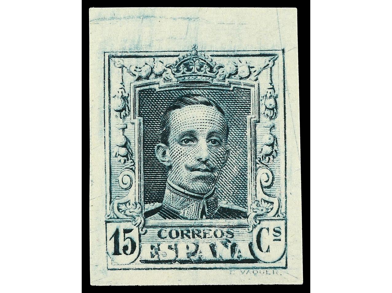 ESPAÑA. 15 cts. verde SIN DENTAR, al dorso numeración auténtica B285,218. Muy bonito. Ed.315s. Cat. 575€. (Image1)