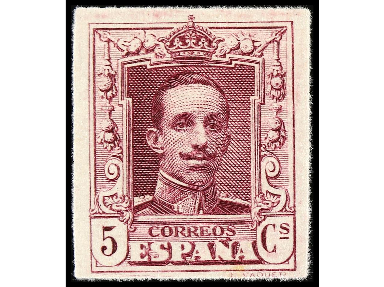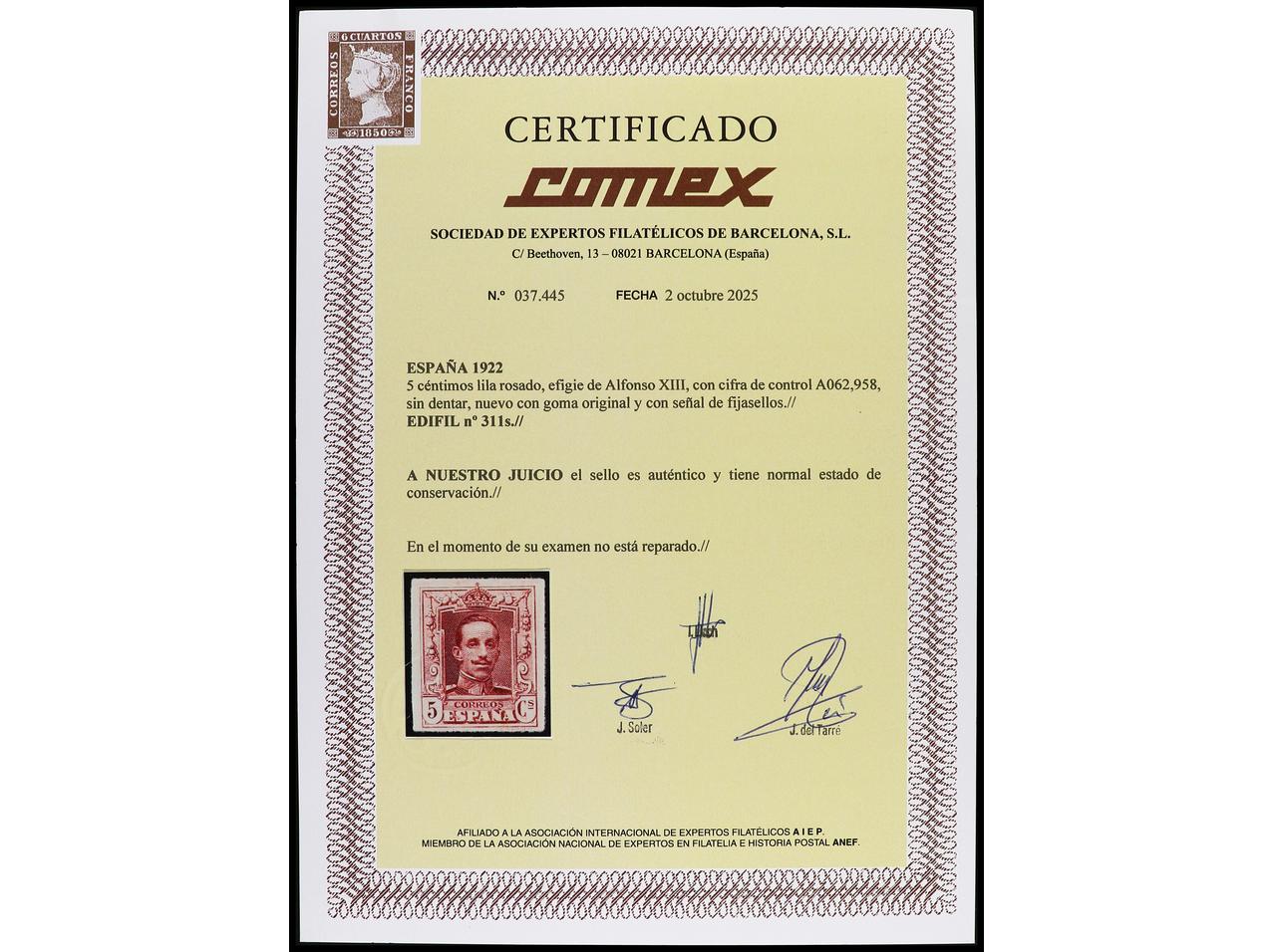 ESPAÑA. 5 céntimos lila, SIN DENTAR. Cert. COMEX. Ed.311s. Cat. 1.120€. (Image1) (Image2)