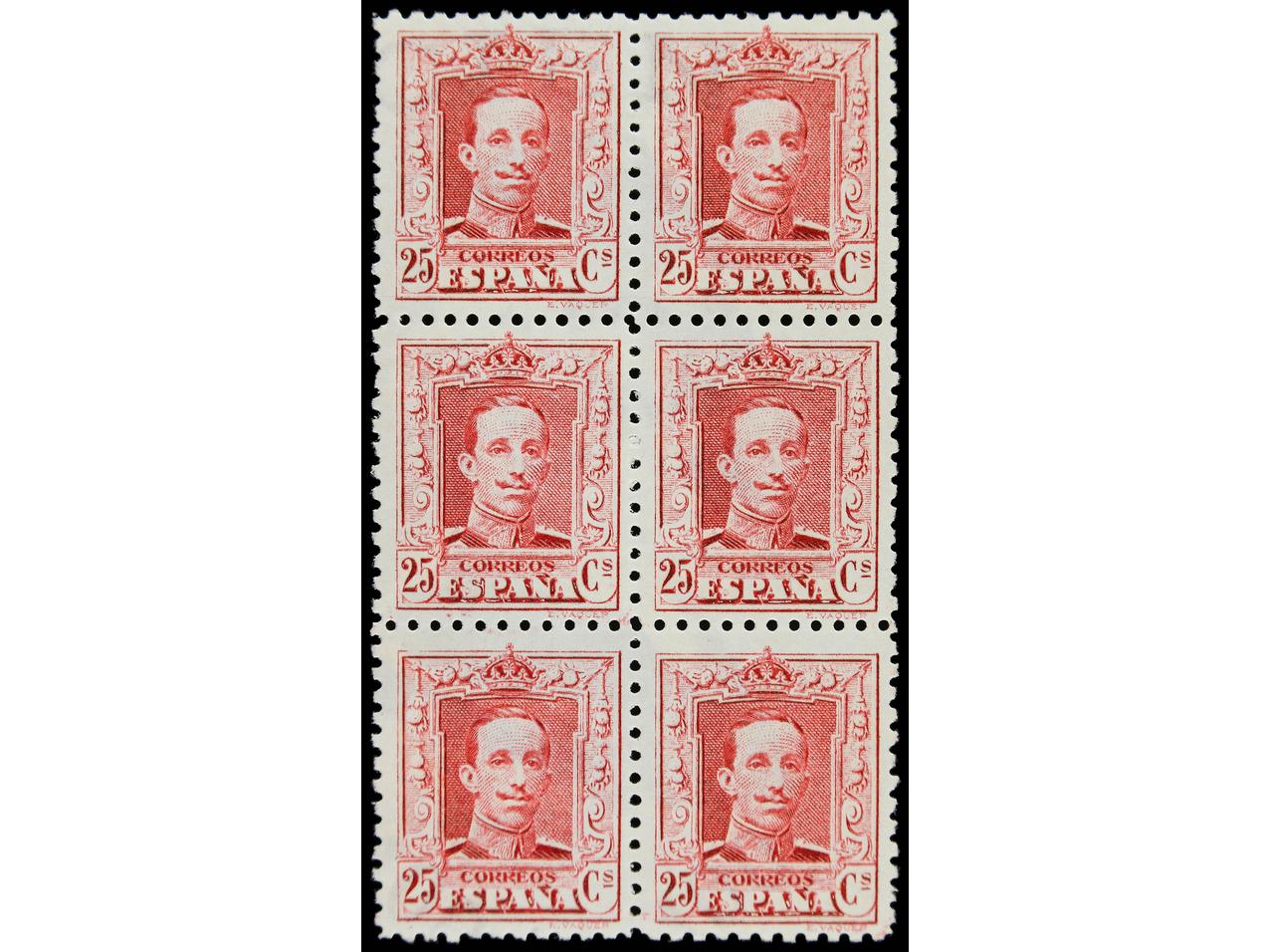 ESPAÑA. 25 cts. carmín. Bloque de seis. Papel con filigrana BILLETE DE BANCO. PRECIOSO. Ed.317Ap. Cat. 1.584€. (Image1)