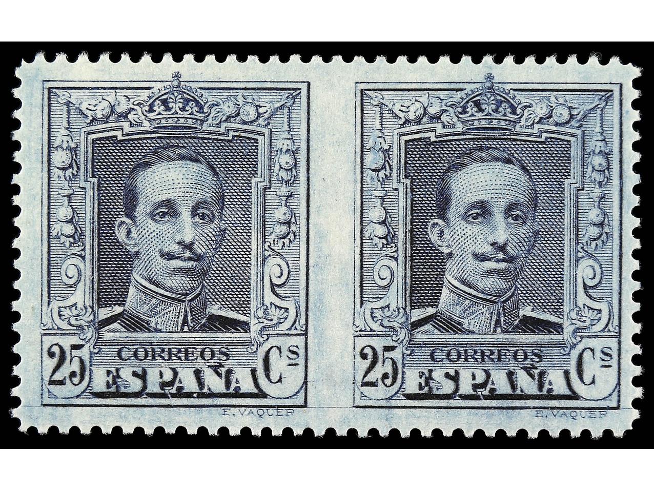 ESPAÑA. NO EXPENDIDOS. 25 cts. azul tipo II. Pareja SIN DENTAR EN MEDIO. No reseñada. Ed.NE 24. (Image1)