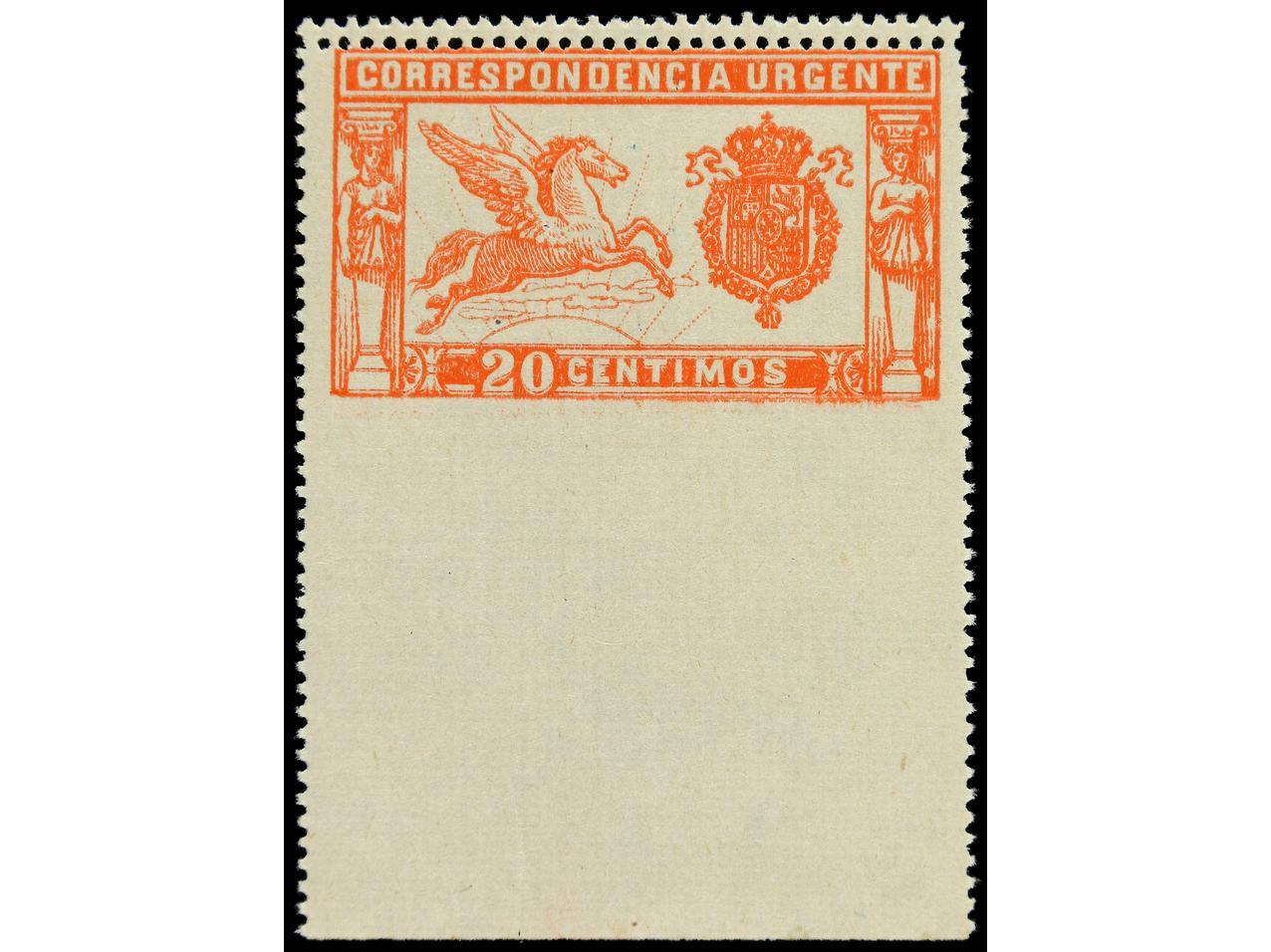 ESPAÑA. 20 cts. rojo. SIN DENTAR MARGEN INFERIOR y doble dentado margen superior. Ed.324smz. Cat. 340€. (Image1)