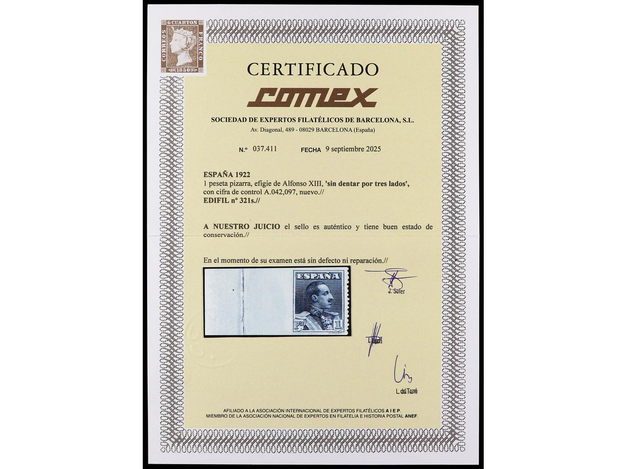 ESPAÑA. 1 pta. gris SIN DENTAR POR TRES LADOS al dorso numeración auténtica A 042,097. RARÍSIMA, sólo 10 piezas conocidas. Cert. COMEX. Ed.321.
