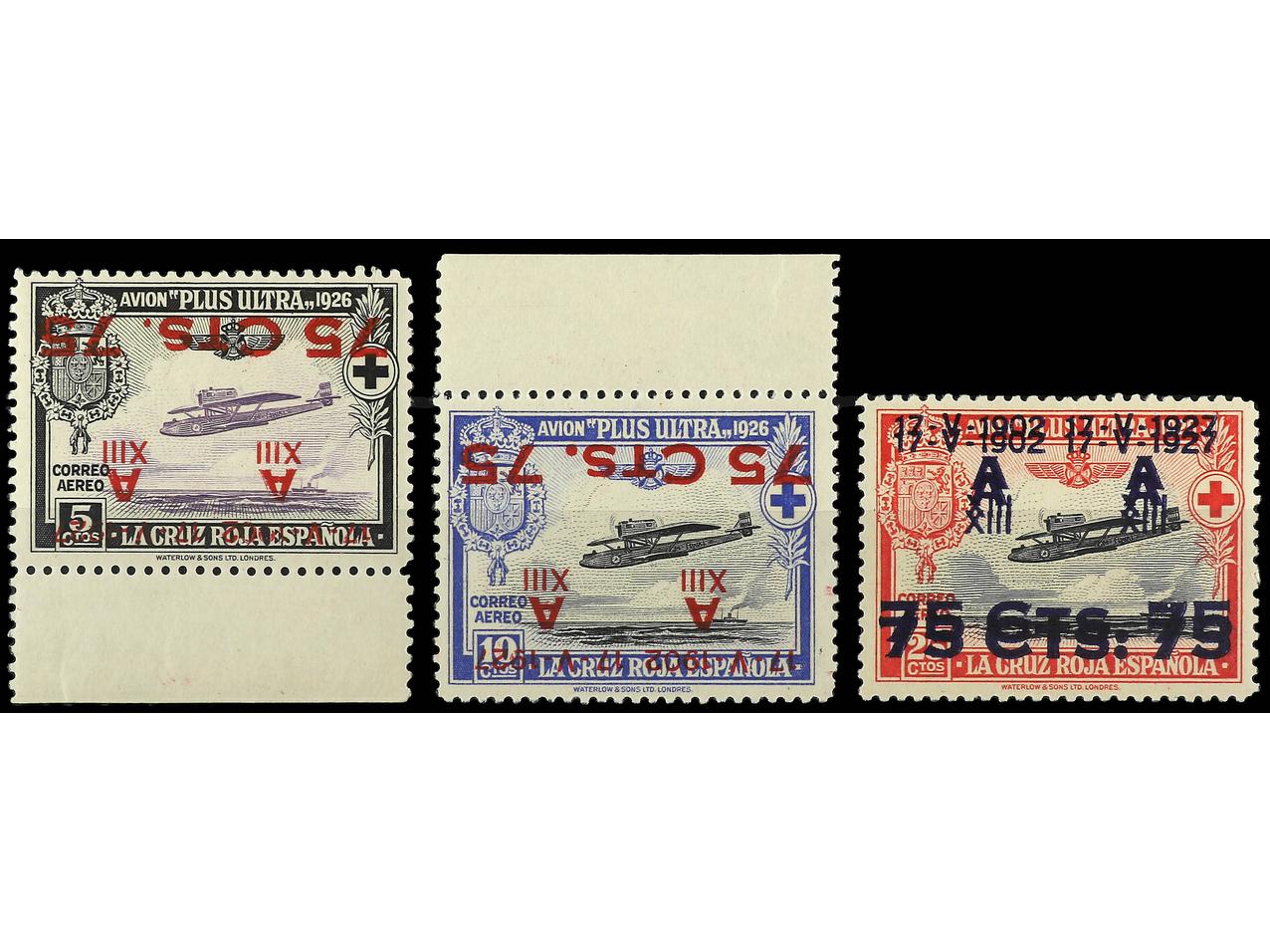 ESPAÑA. 75 cts. s. 5 cts. y 75 cts. s. 10 cts. Habilitación INVERTIDA y 75 cts. s. 25 cts. Habilitación DOBLE. PRECIOSOS. Ed.388/89hi y 390hh.