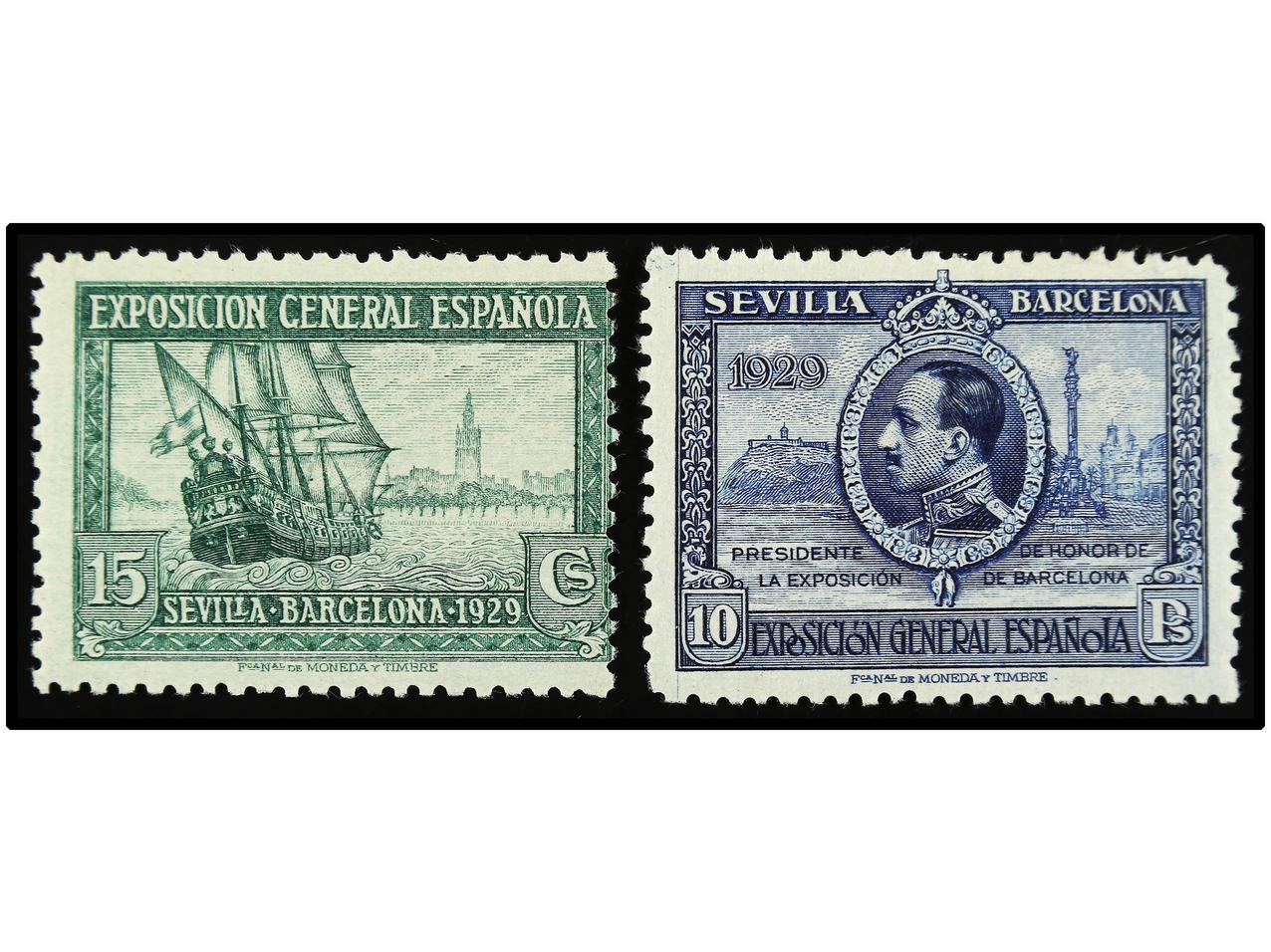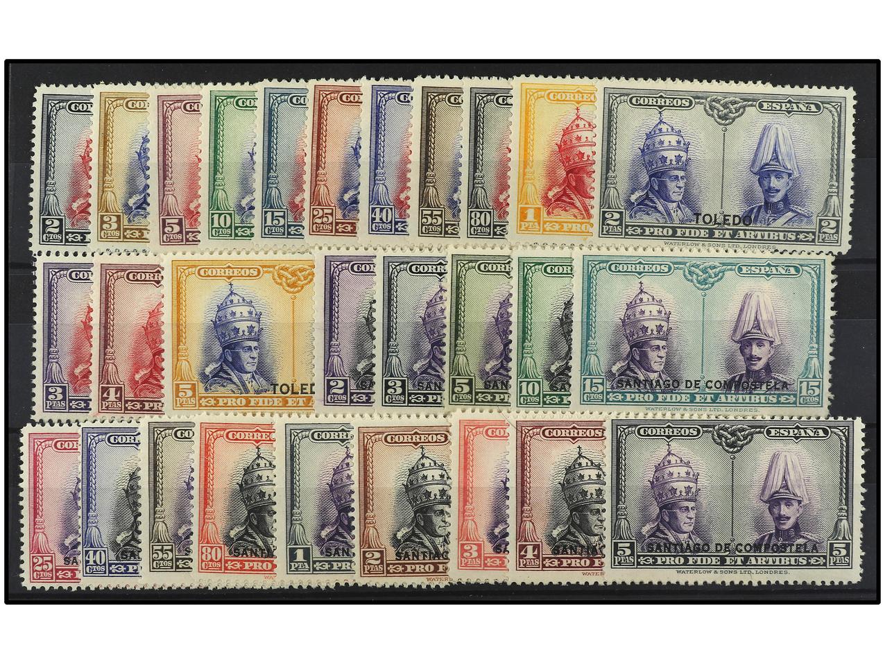 ESPAÑA. SERIE COMPLETA con habilitaciones TOLEDO y SANTIAGO DE COMPOSTELA, procedentes del carnet conmemorativo en el que estaban adheridos. RAROS. Ed.402/17H, 418/33H. (Image1) (Image2)