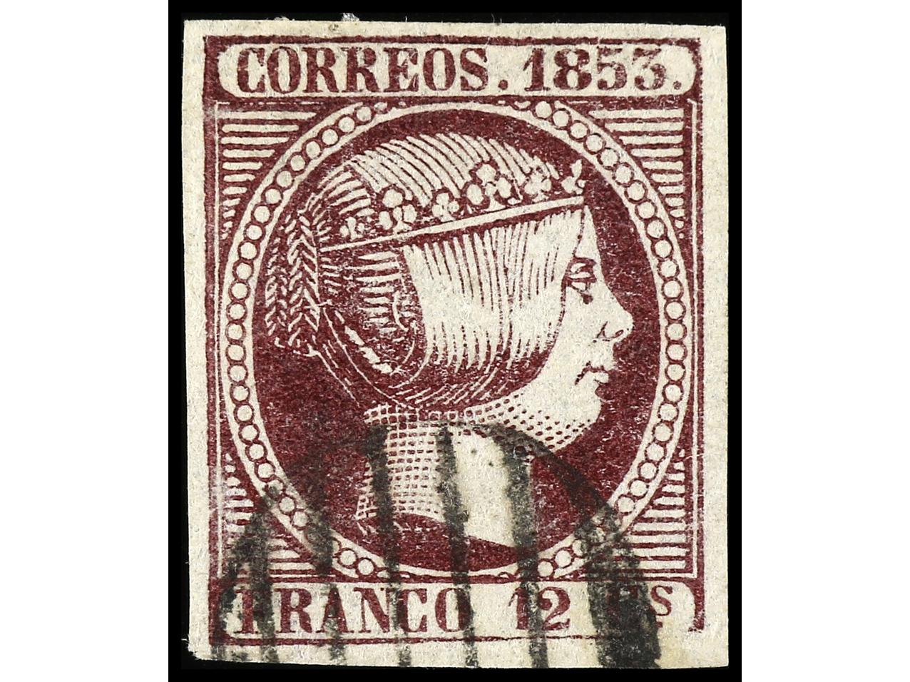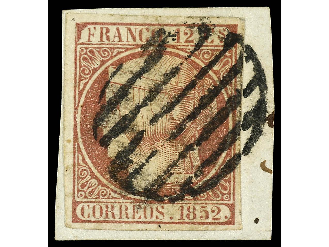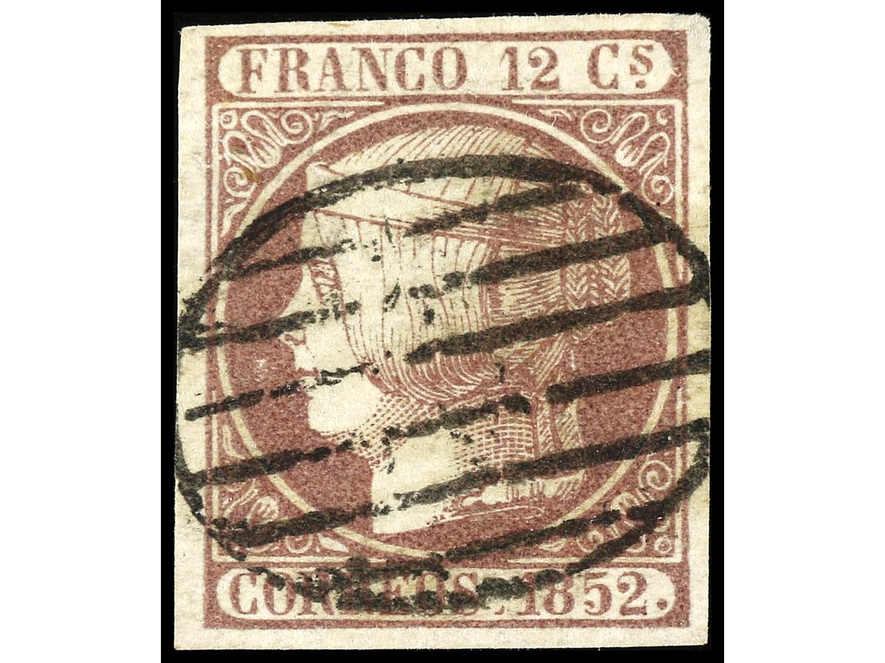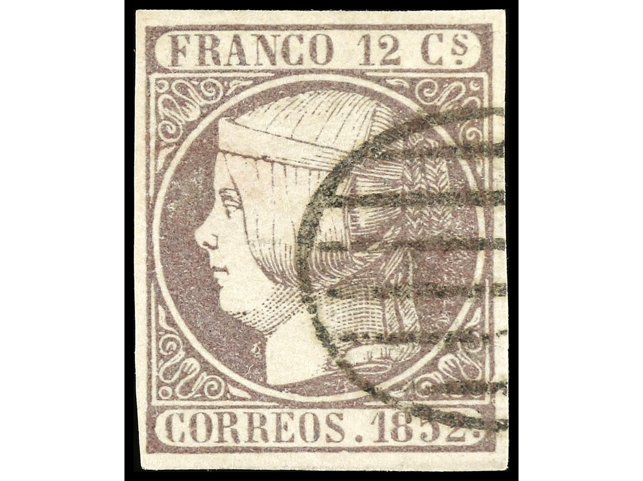 ESPAÑA. 1852. IGUALADA a HUESCA. 12 cuartos lila. Mat. PARRILLA. MAGNÍFICA. Cert. CEM. Ed.13. (Image1) (Image2)