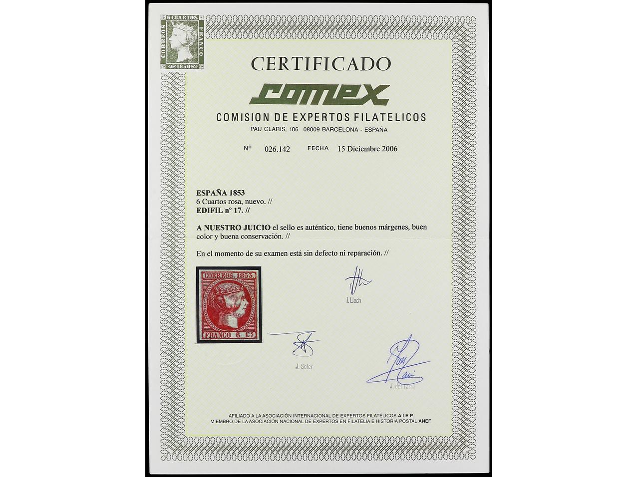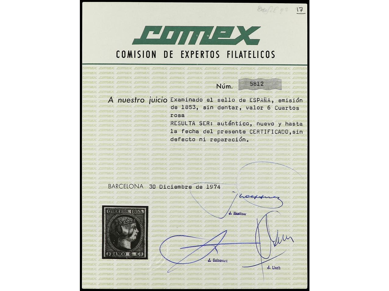 ESPAÑA. 6 cuartos rosa. Color muy intenso y márgenes completos. Muy buen ejemplar. Cert. COMEX. Ed.17. Cat. 600€. (Image1) (Image2)