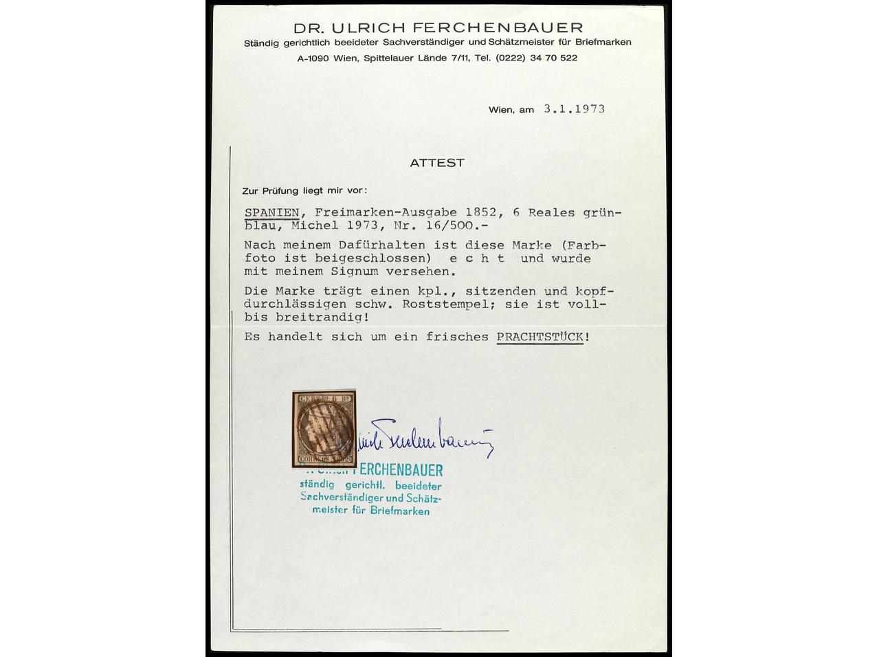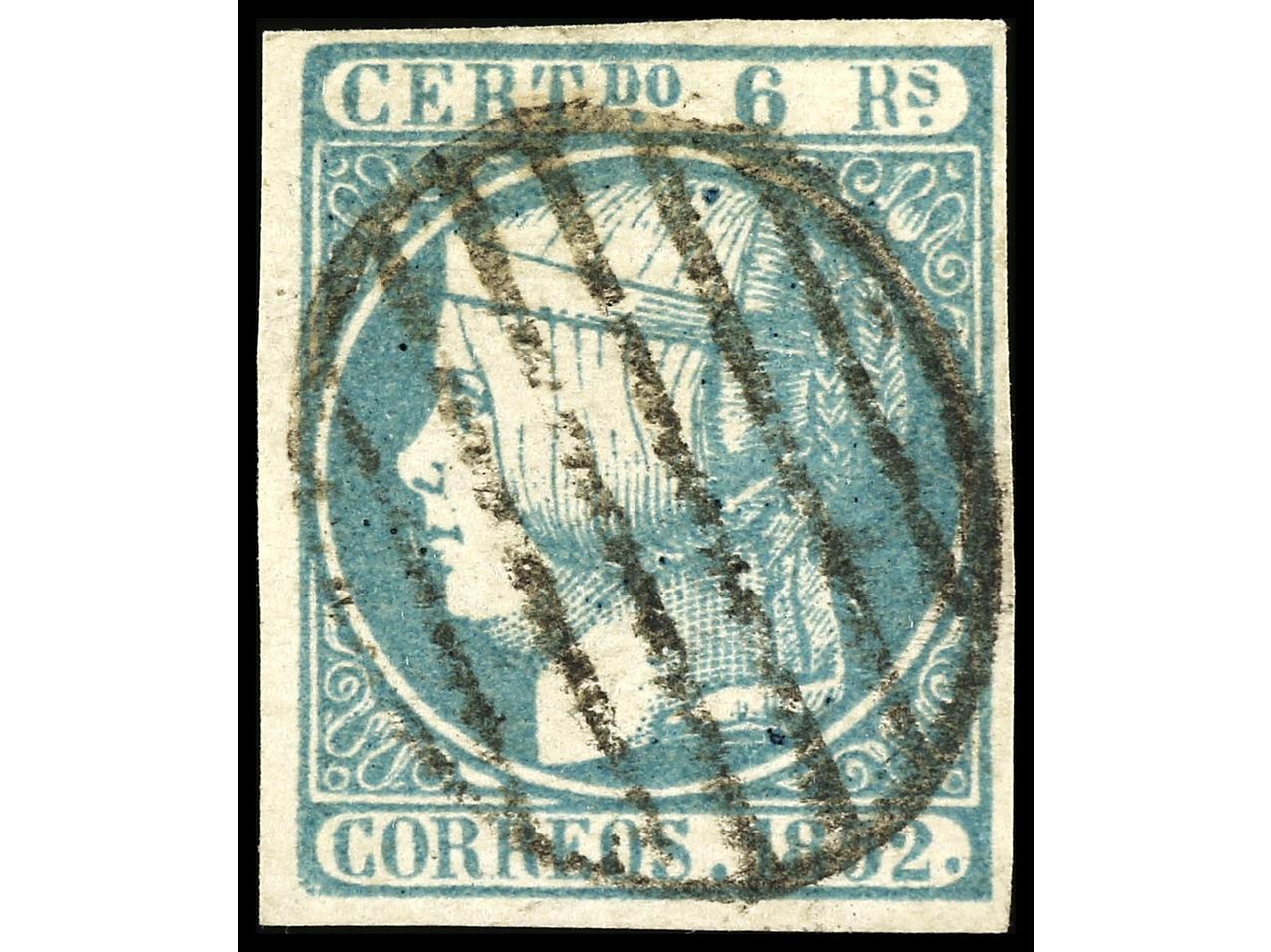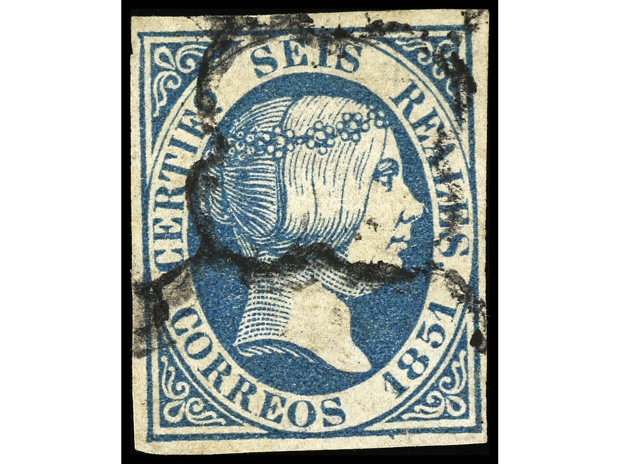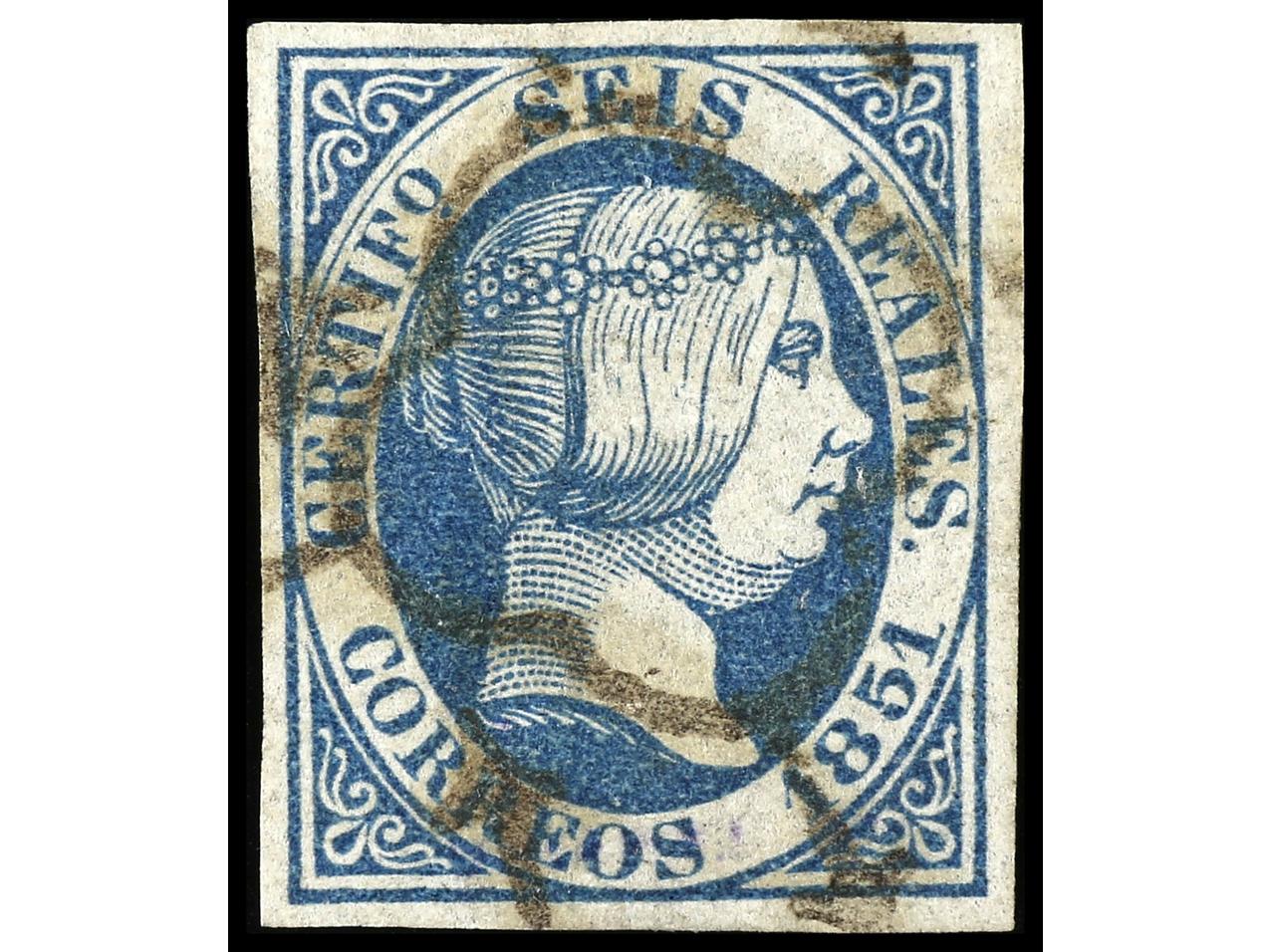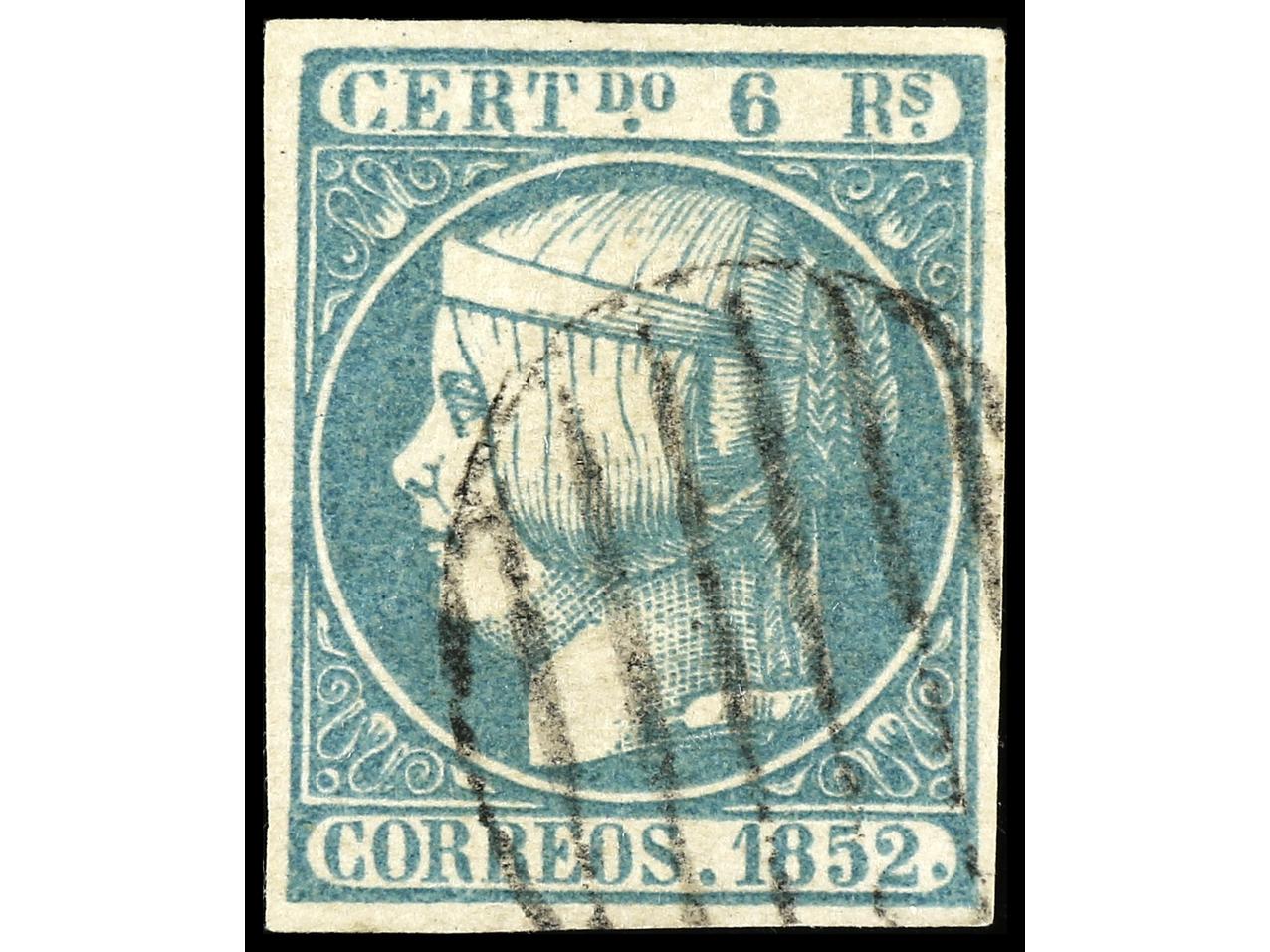 ESPAÑA. 6 reales azul Mat. Parrilla. Muy buen ejemplar. Cert. COMEX y FERCHENBAUER. Ed.16. Cat. 700€. (Image1) (Image2)