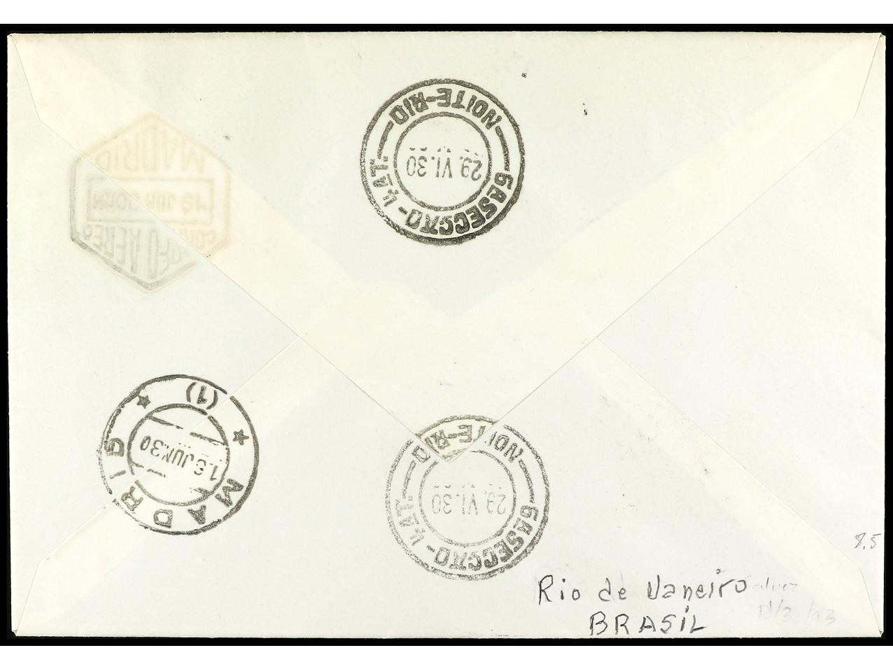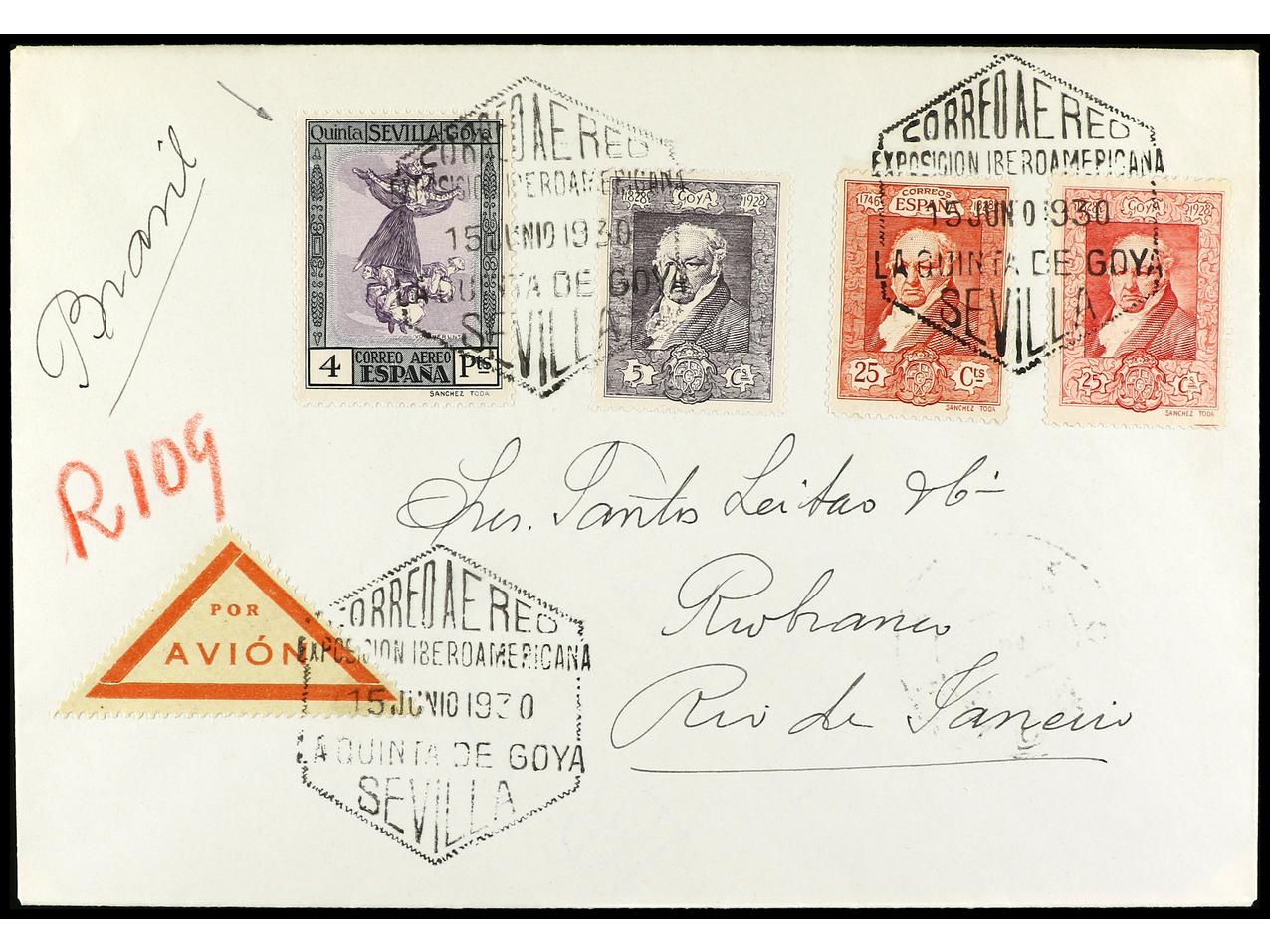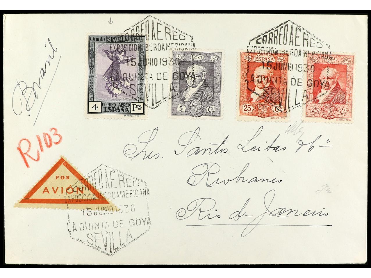 ESPAÑA. 1930. SEVILLA a RÍO DE JANEIRO. 5 cts. lila, 25 cts. rojo (2) y 4 pts. azul y violeta ERROR DE COLOR. RARA, al dorso llegada. Ed.528cc, 502, 507/08.
