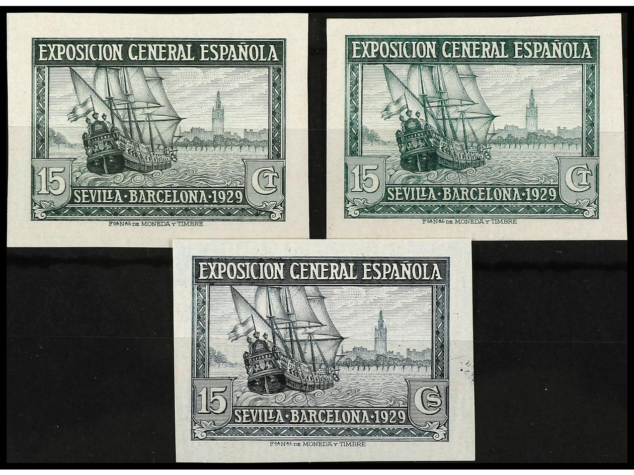 ESPAÑA. EXPO. SEVILLA y BARCELONA. PRUEBAS DE PUNZÓN. 15 cts. verde. Tres pruebas en diferentes tonos de color sobre papel estucado. (Gálvez 2393).