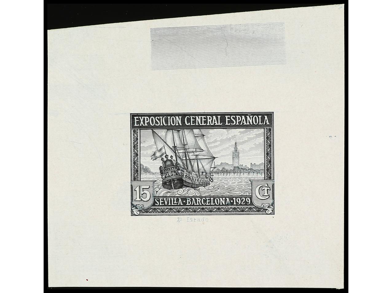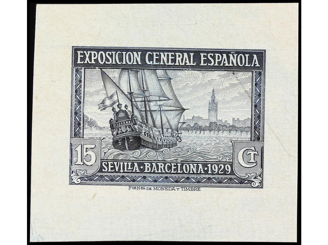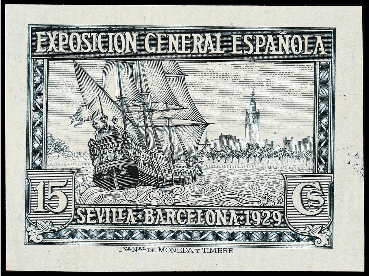 ESPAÑA. EXPO. SEVILLA y BARCELONA. PRUEBA DE PUNZÓN. 15 cts. negro sobre papel estucado. RARA. (Gálvez 2390). (Image1)