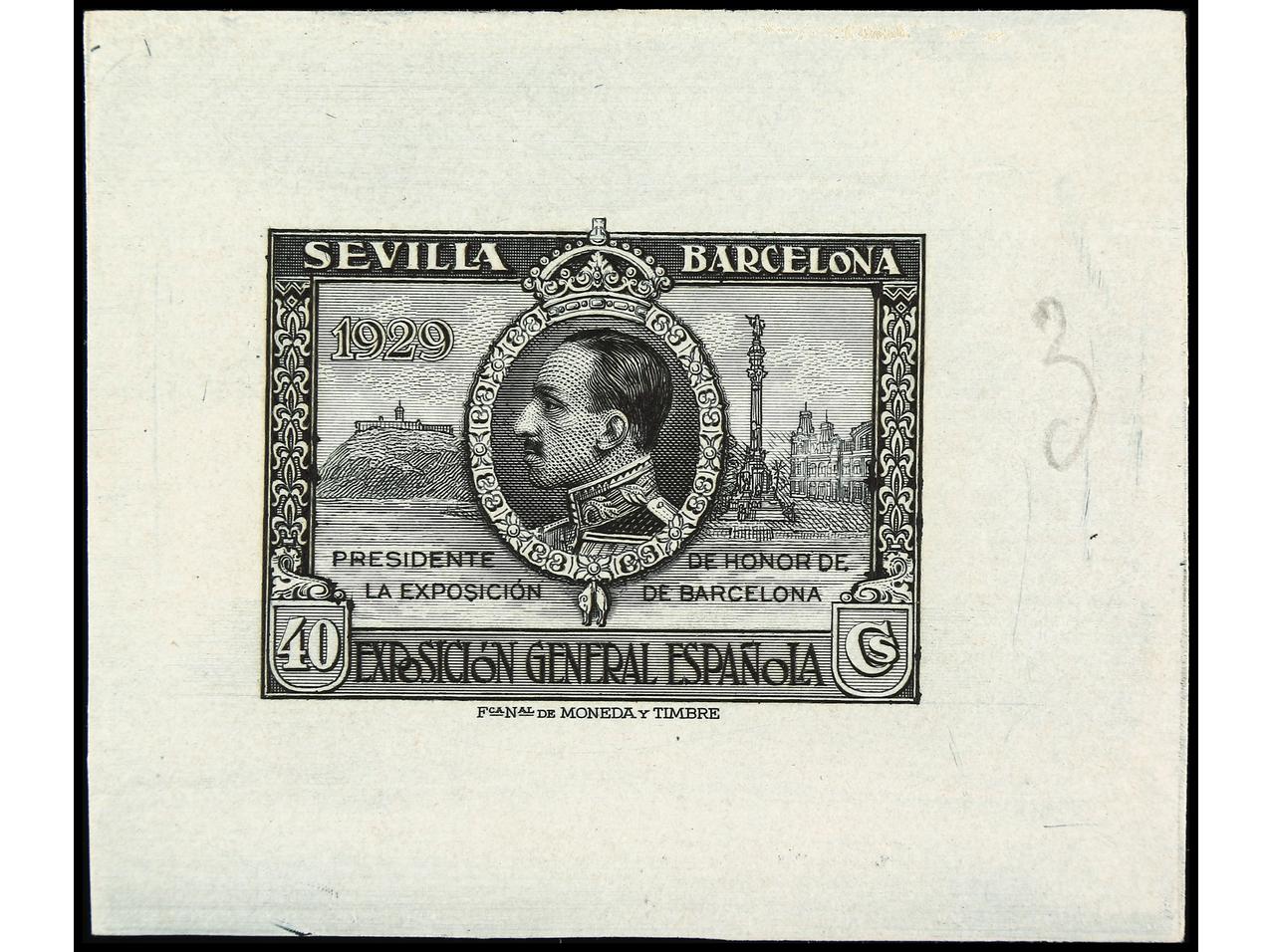 ESPAÑA. EXPO. SEVILLA y BARCELONA. PRUEBA DE PUNZÓN. 40 cts. negro verdoso sobre papel estucado. RARA. (Gálvez 2399). (Image1)